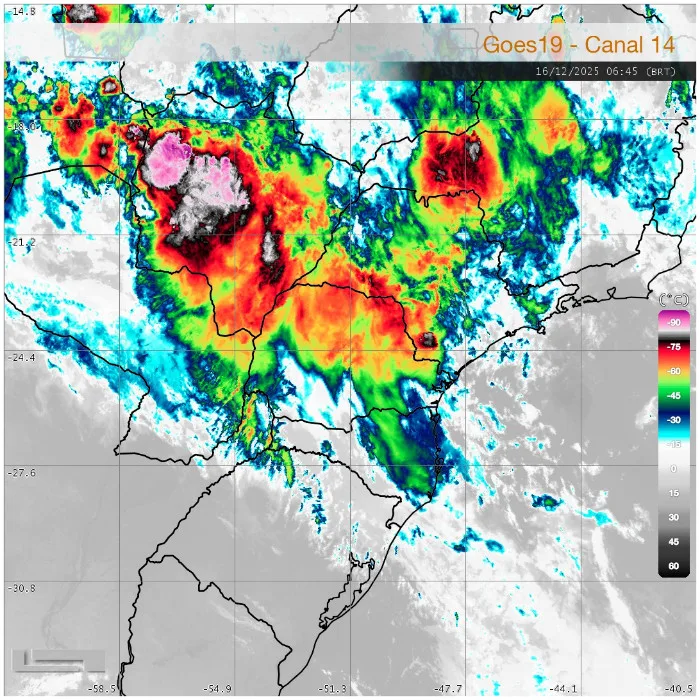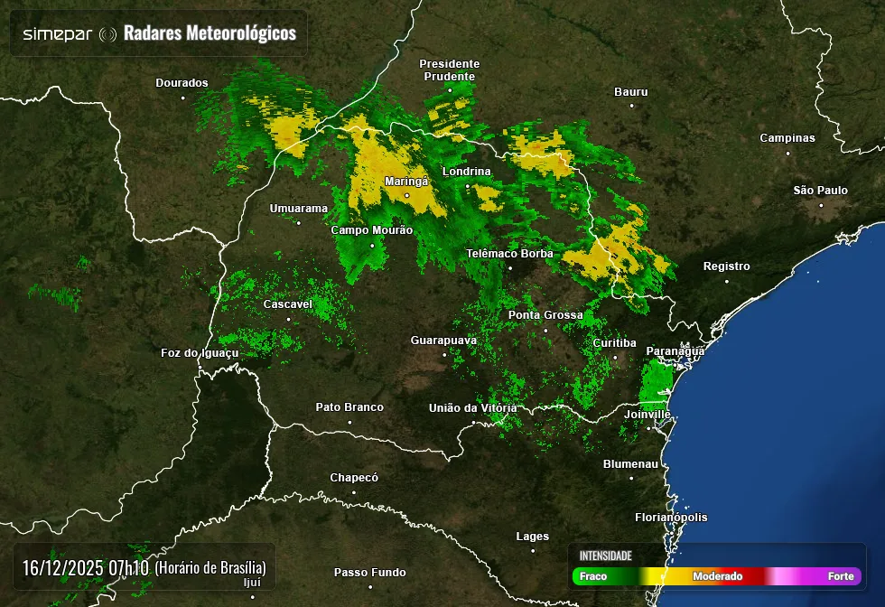 O Sistema de tecnologia e monitoramento ambiental do PARANÁ (SIMEPAR) informa que o deslocamento de uma frente fria pelo oceano Atlântico continua a influenciar as condições meteorológicas sobre o estado nesta terça-feira, 16 de dezembro.