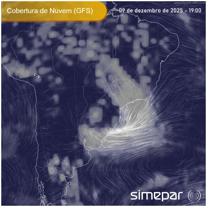 - Leste e Litoral: A nebulosidade se mantém mais variável. O gradiente de pressão atmosférica, no entanto, deve manter os ventos mais persistentes, especialmente entre a Região Metropolitana de Curitiba (RMC) e as praias.