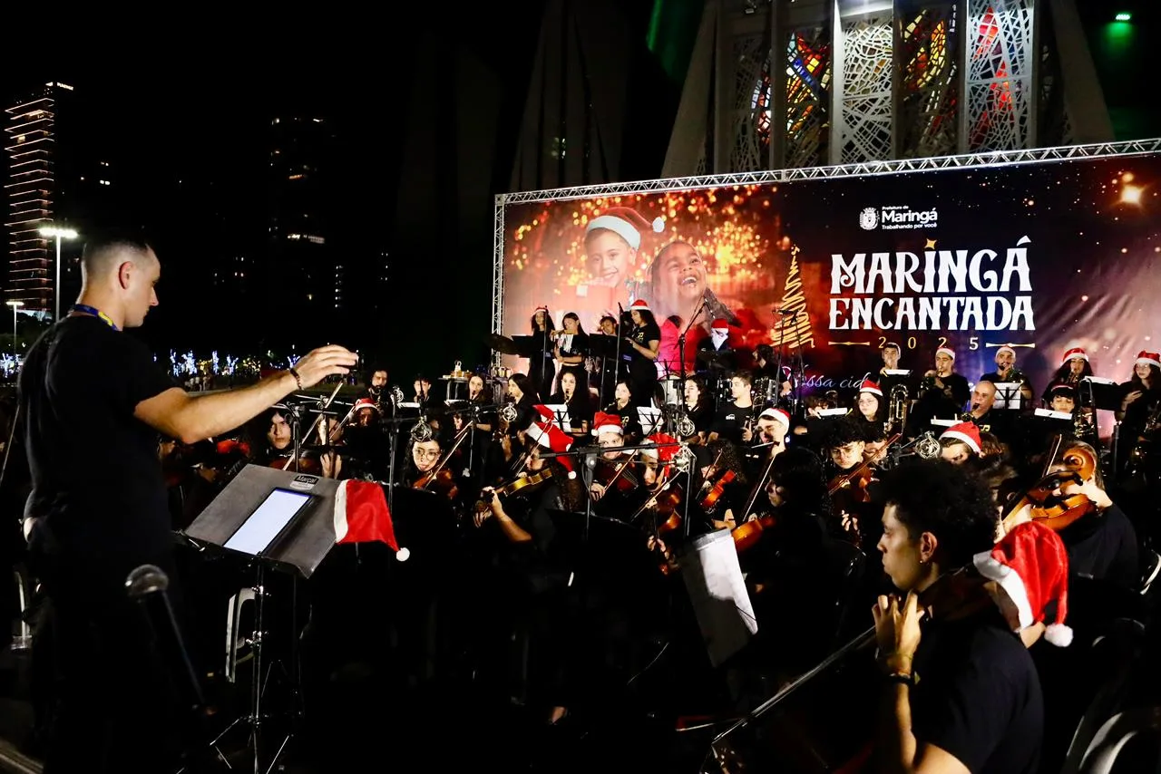 De volta ao Centro, a Maringá Encantada 2025 foi oficialmente aberta na noite deste sábado, 6, reunindo um grande público na Praça da Catedral para acompanhar a chegada do Papai Noel, o acendimento da iluminação natalina e apresentação da Orquestra do Sesc. Mais de 5 mil pessoas prestigiaram o evento, em uma noite marcada pela magia do Natal que envolveu famílias, crianças, maringaenses e visitantes da região.