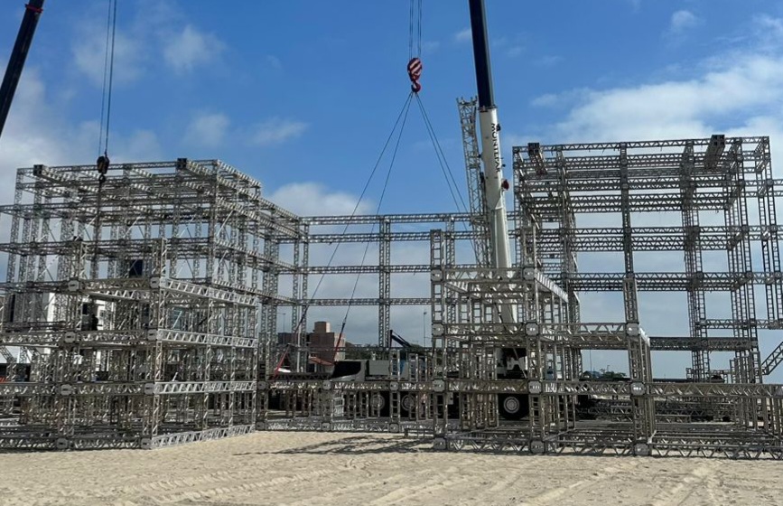 Destaque: O volume de equipamentos é massivo. São 55 carretas transportando toneladas de aço, som e luz para garantir que o público tenha visão e áudio perfeitos em qualquer ponto da areia.