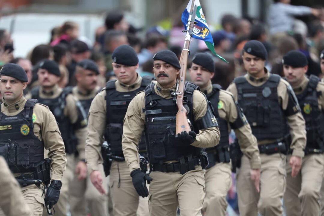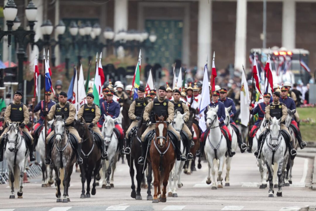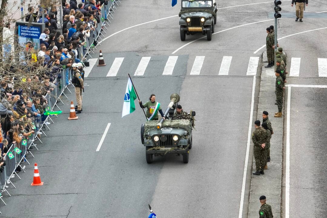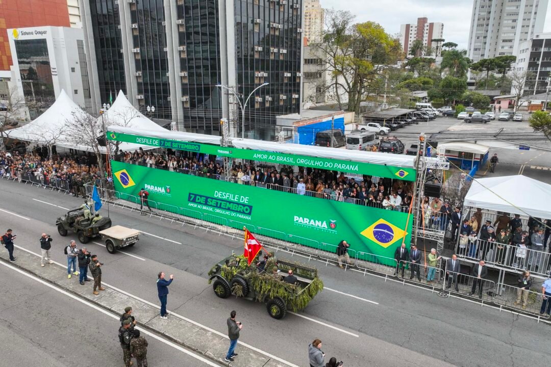 Milhares de pessoas acompanharam neste domingo (7), em Curitiba, o desfile cívico-militar em celebração aos 203 anos da Independência do Brasil. O vice-governador Darci Piana participou da cerimônia, ao lado do comandante da 5ª Divisão do Exército, general Ricardo José Nigri — que abriu o desfile a bordo do Blindado Guarani, após a revista das tropas — e autoridades civis e militares.