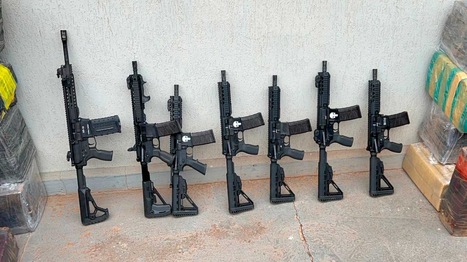 Ao todo, foram localizadas 75 pistolas de marcas diversas e sete fuzis com numeração suprimida, além de carregadores e alongadores de armamentos. Além disso, foram localizadas cerca de duas toneladas de maconha.