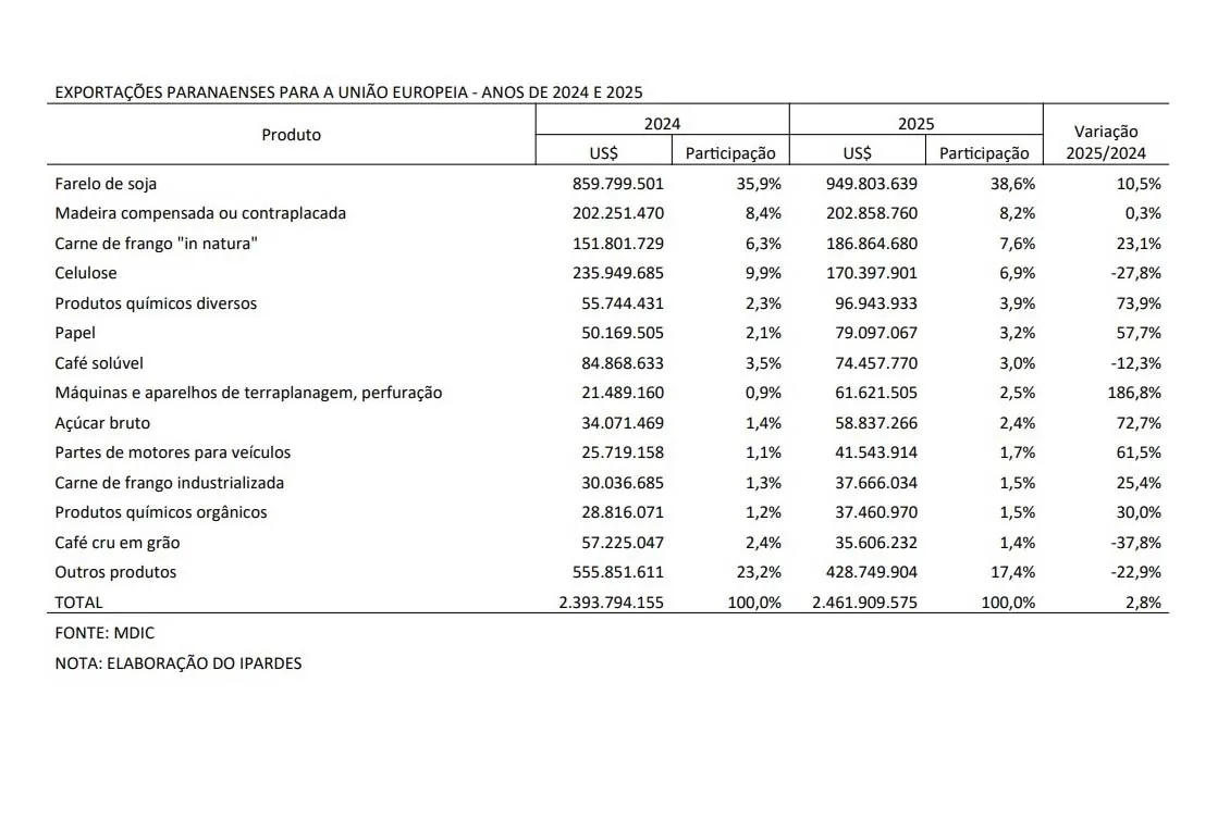 Em 2025, as exportações do Paraná para a União Europeia somaram US$ 2,46 bilhões, representando 10,4% do total das vendas do Estado para o Exterior, de acordo com dados do Ministério do Desenvolvimento, Indústria, Comércio e Serviços (MDIC). Esse valor superou, por exemplo, as exportações destinadas à Argentina (US$ 1,83 bilhão), Estados Unidos (US$ 1,21 bilhão) e México (US$ 890 milhões), o que ressalta a importância do mercado europeu.