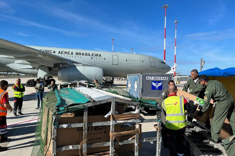 KITS PARA GAZA – O voo que pousou em Roma transporte também 35 purificadores de água e dois kits de medicamentos e insumos de saúde, suficientes para atender até 3 mil pessoas ao longo de um mês.