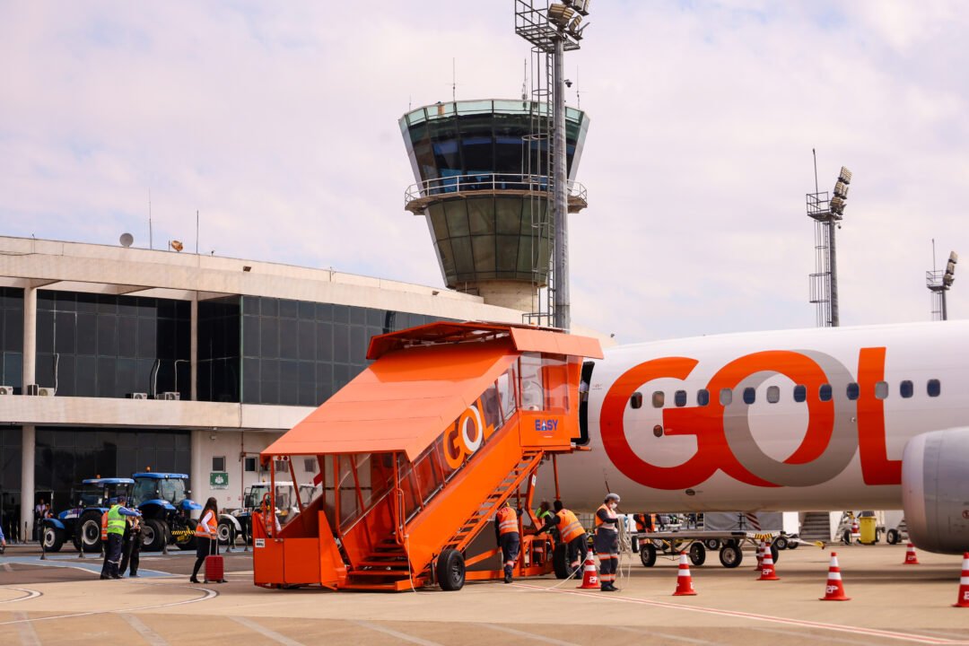 A escada, que foi projetada e construída pela empresa maringaense Easy Ground Service Solutions, é um projeto-piloto da companhia GOL Linhas Aéreas.