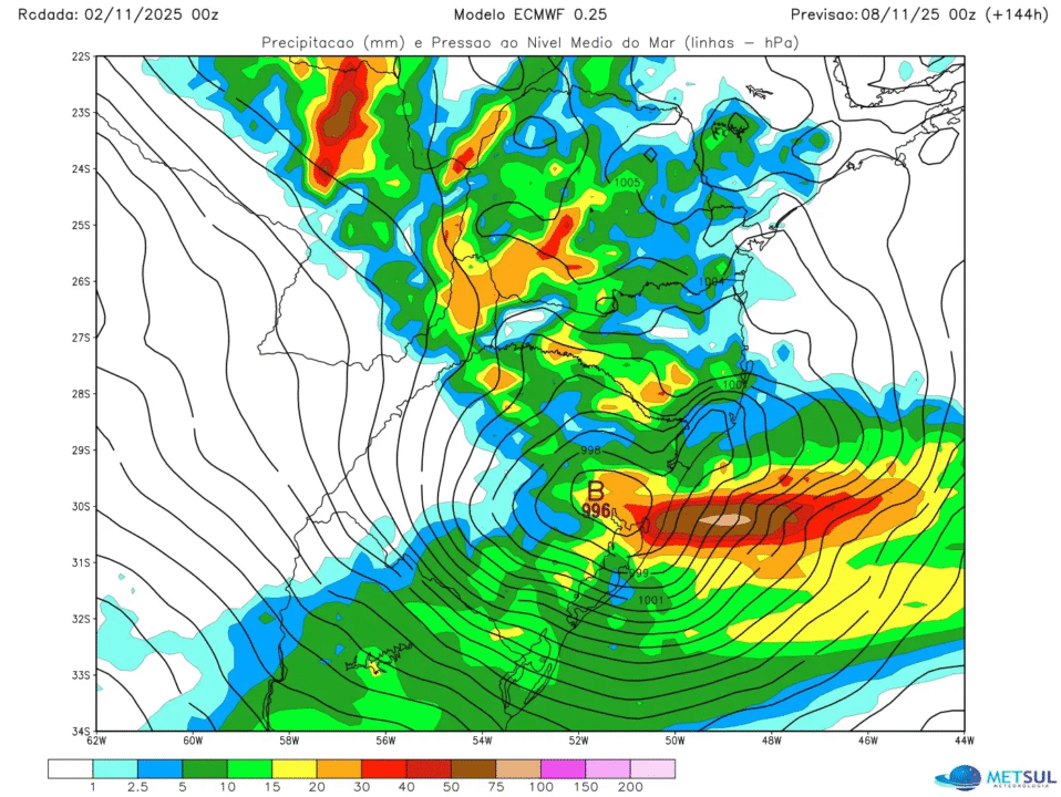 Maringá, 03 de novembro de 2025 – A MetSul Meteorologia adverte a população e as autoridades do Sul do Brasil sobre uma potencial situação de muito alto risco meteorológico para o final desta semana. Modelos meteorológicos internacionais indicam a provável formação de um ciclone intenso sobre o Rio Grande do Sul, podendo trazer chuva torrencial, temporais severos e ventos muito fortes.