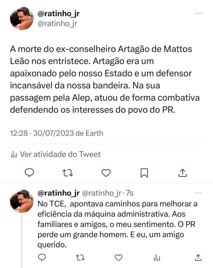 “Artagão sempre foi um homem público muito dedicado e que marcou o seu nome na história do Paraná e do Tribunal de Contas, que exerce um papel fundamental para a sociedade. Meus sentimentos a todos os familiares e ao meu amigo Artagão de Mattos Leão Junior nesse momento difícil”, disse o governador Carlos Massa Ratinho Junior.