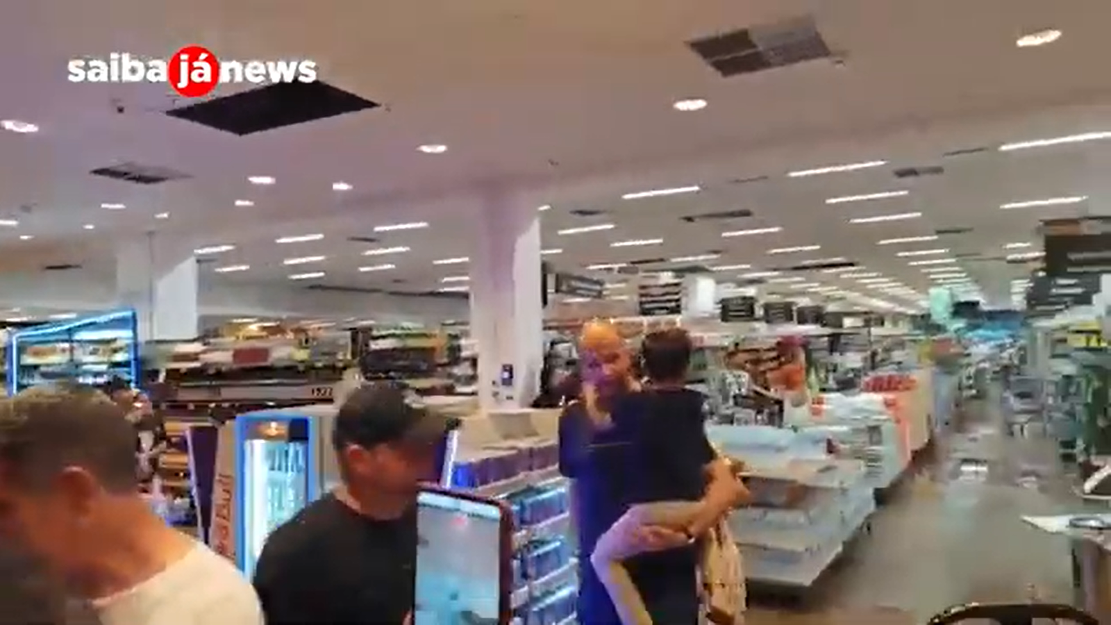 Supermercado em Campo Mourão, no Paraná, inundado e no escuro após forte chuva de granizo