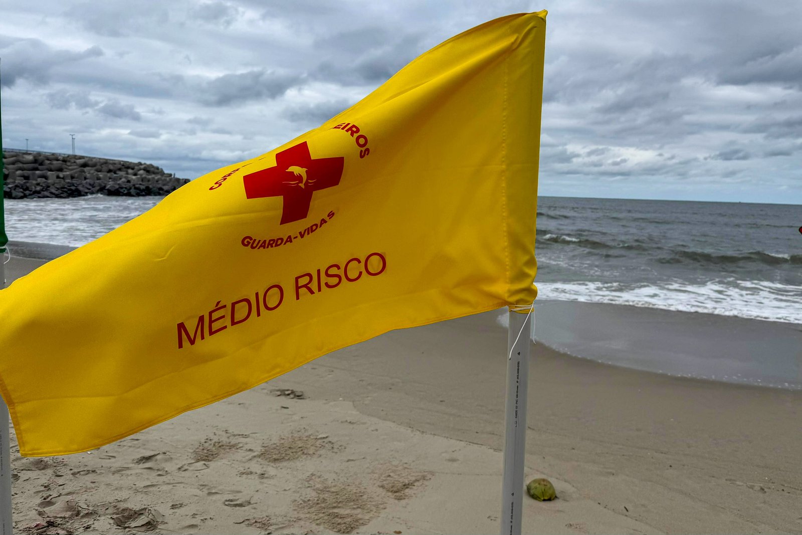 Os guarda-vidas têm ainda outras duas bandeiras para orientar a população. Uma delas é a de perigo, que indica que há algum problema naquele ponto específico da praia, como um buraco, uma corrente de retorno muito forte. Em resumo, não é aconselhável se refrescar por ali.