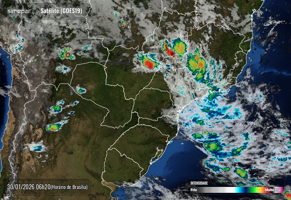 O cenário meteorológico no Paraná segue com as características clássicas da estação. De acordo com o Simepar, o calor e a umidade devem ditar o ritmo das próximas 48 horas, com temperaturas encostando nos 30 °C em diversas regiões e previsão de instabilidades pontuais.