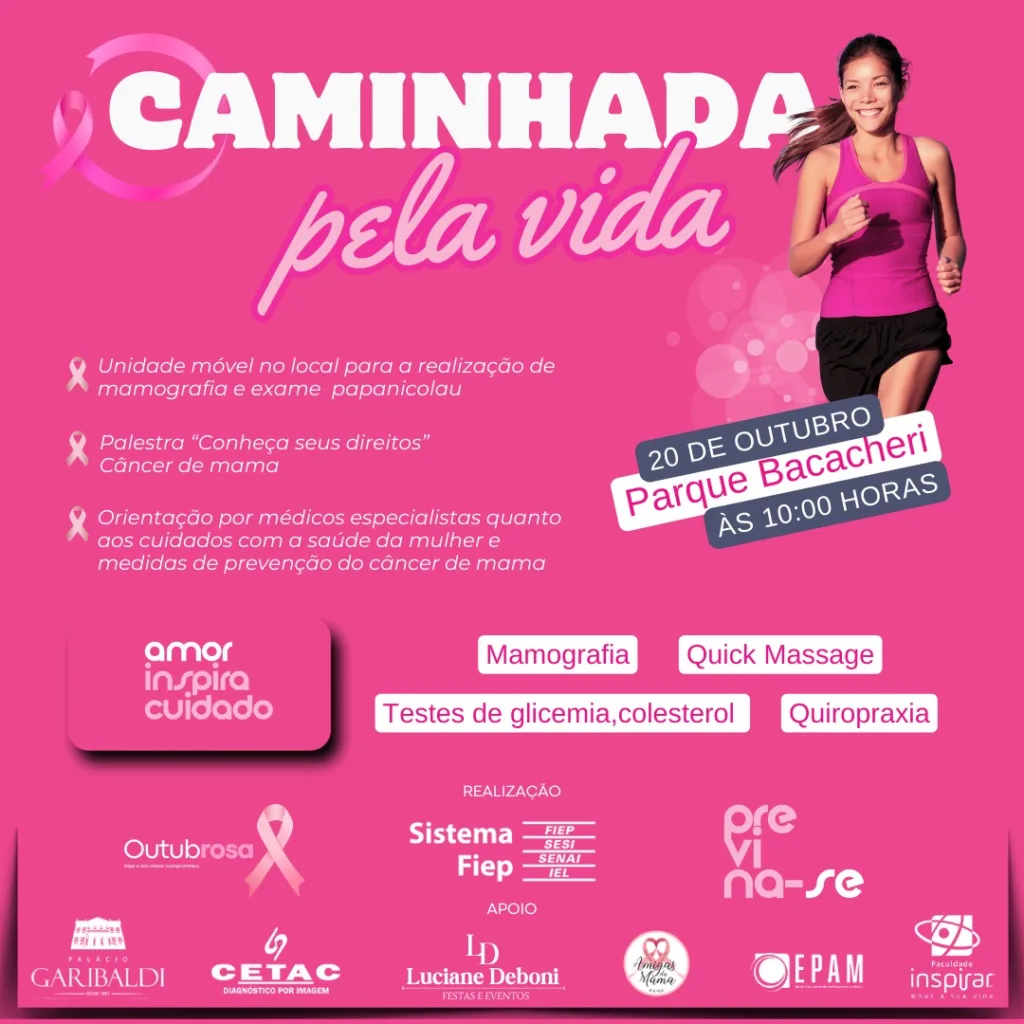 A Caminhada é uma parceria entre diversas entidades, incluindo o Sistema Fiep, Palácio Garibaldi, Cetac, Amigas da Mama, Faculdades Inspirar, Luciane Deboni, EPAM (Escola Paranaense de Aperfeiçoamento Médico), Aché Laboratórios, entre outras instituições comprometidas com a saúde da mulher.
