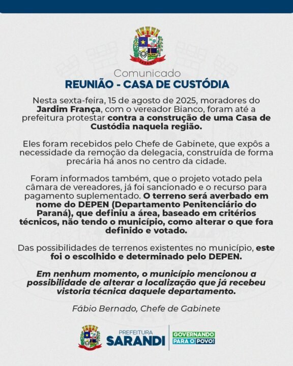 O comunicado ressalta que a escolha do terreno foi feita pelo Departamento Penitenciário do Paraná (DEPEN), com base em critérios técnicos, e que a prefeitura não tem autonomia para alterar a localização definida. O terreno será transferido para o nome do DEPEN, que já realizou uma vistoria técnica no local. A prefeitura afirmou que, entre as opções de terrenos disponíveis no município, o local no Jardim França foi o escolhido e determinado pelo órgão estadual.