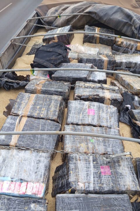 Após fiscalização ao veículo de carga com o uso dos cães farejadores, que indicaram a presença do entorpecente, os policiais verificaram o compartimento de carga de arroz, confirmando a suspeita e localizando esse grande volume de tabletes de maconha.