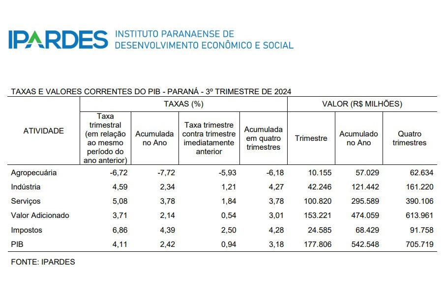 Após crescer 0,63% no 1º trimestre e 2,85% no 2º trimestre, o Produto Interno Bruto (PIB) paranaense apresentou expansão de 4,11% no 3º trimestre de 2024, o que representa R$ 177,8 bilhões, segundo dados do Instituto Paranaense de Desenvolvimento Econômico e Social (Ipardes), divulgados nesta segunda-feira (16). O desempenho da economia estadual nesse período mais recente ficou acima da média nacional, que variou 4%, de acordo com o Instituto Brasileiro de Geografia e Estatística (IBGE). As comparações são em relação ao mesmo período do ano anterior.