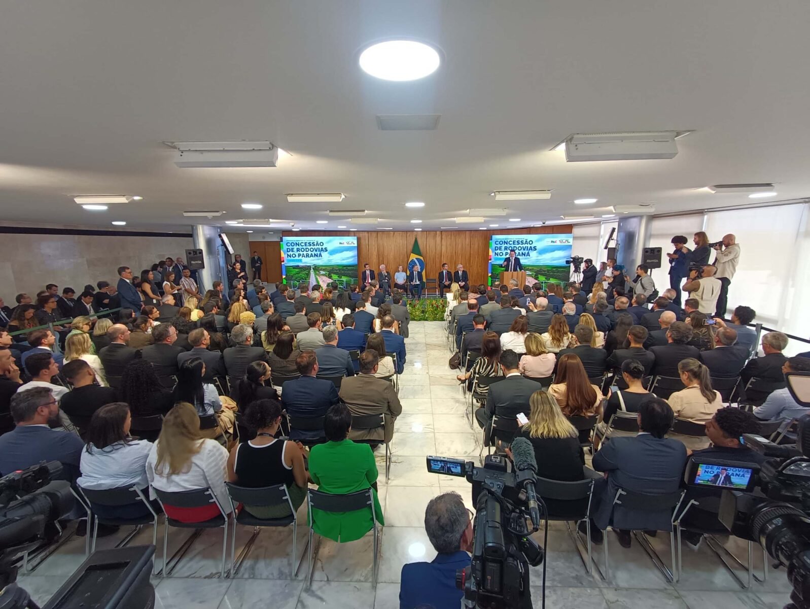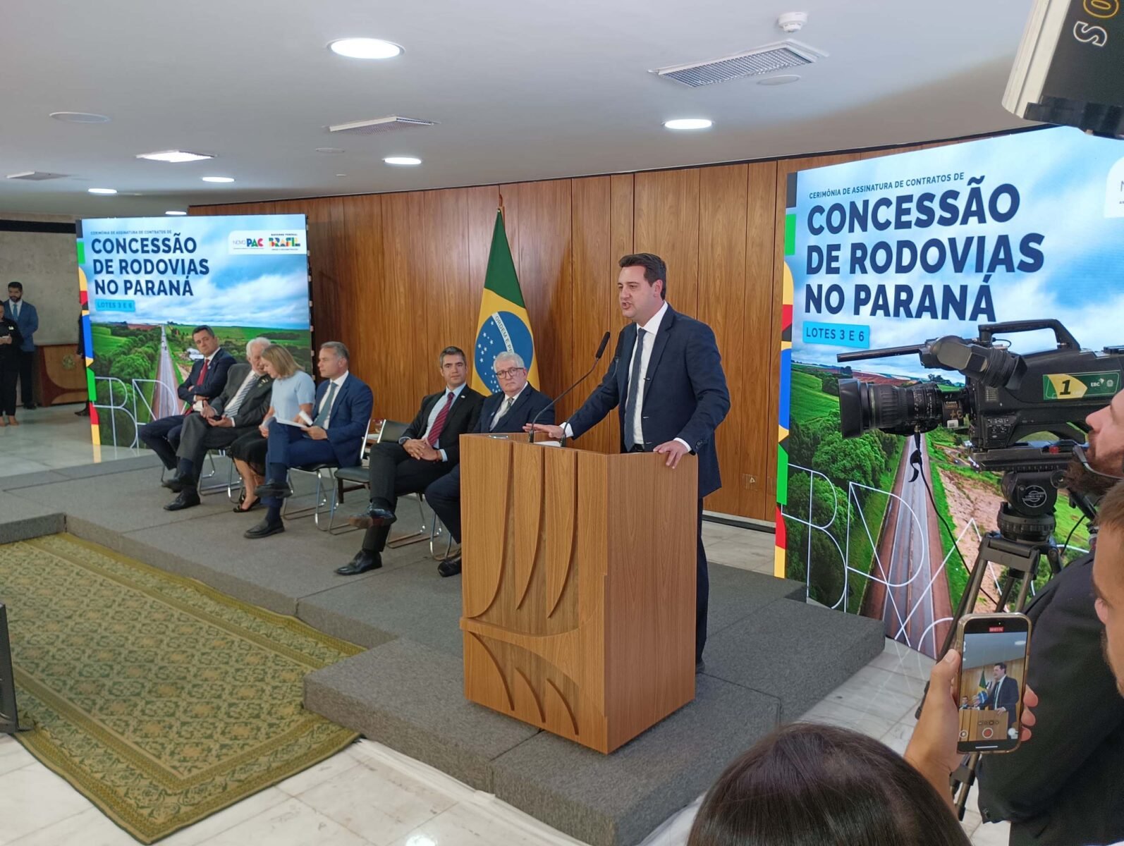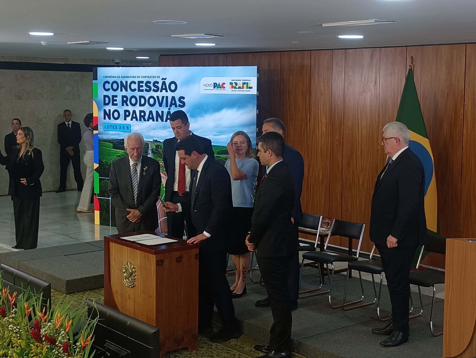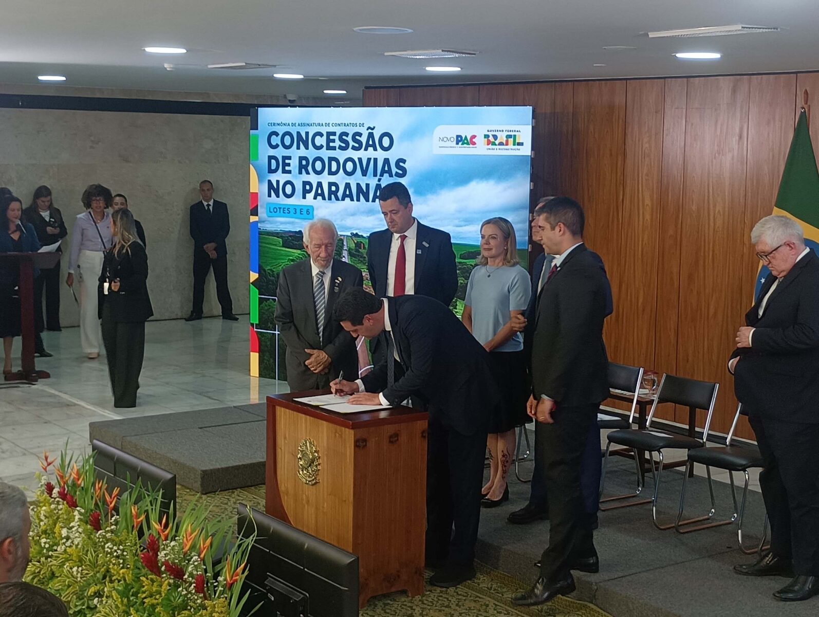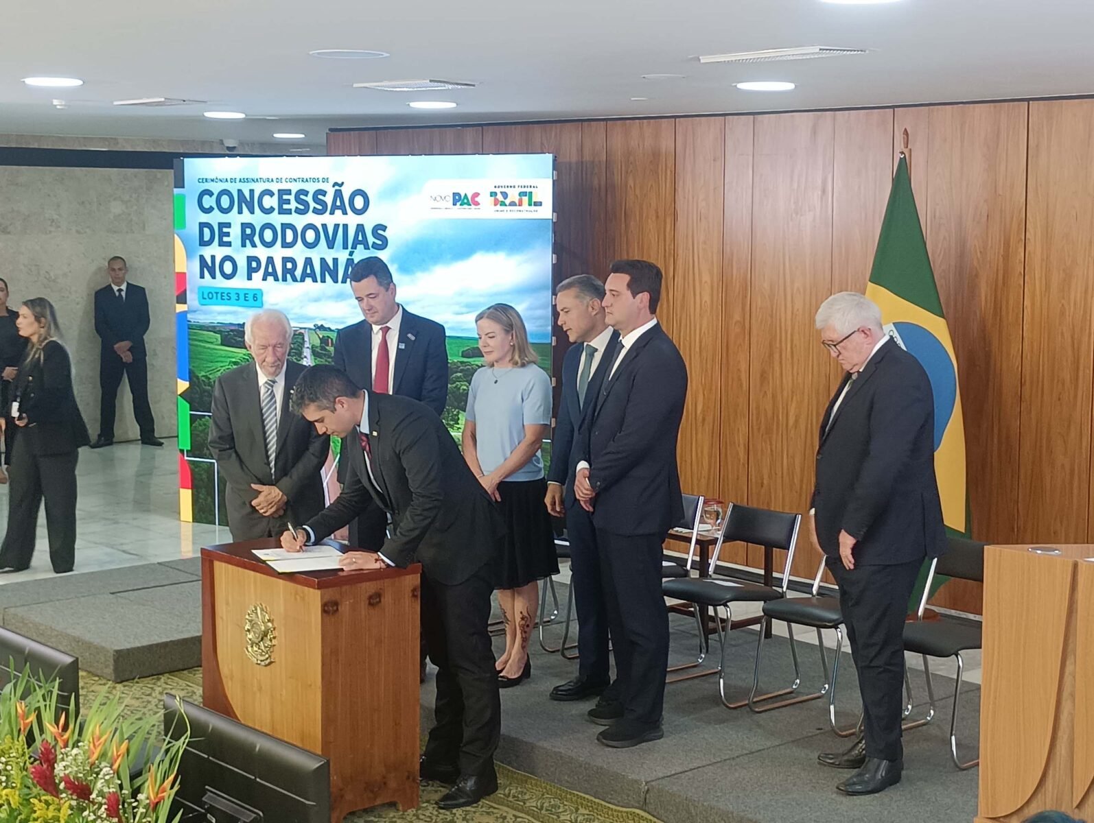PRESENÇAS – Também participaram da assinatura o vice-governador Darci Piana, a ministra-chefe da Secretaria de Relações Institucionais, Gleisi Hoffmann; os secretários estaduais da Infraestrutura e Logística, Sandro Alex; Agricultura e Abastecimento, Márcio Nunes; Saúde, Beto Preto; Comunicação, Cleber Mata; o presidente do DER/PR, Fernando Furiatti; o presidente da Invest Paraná, Eduardo Bekin; o presidente da Itaipu Binacional, Ênio Verri; o presidente do Departamento Nacional de Infraestrutura (DNIT), Fabrício Galvão; o diretor-presidente da EPR Rodovias, José Carlos Cassanig; o diretor-presidente do Grupo Motiva/CCR, Eduardo Camargo; o presidente do Movimento Pró-Paraná, Marcos Domakoski; o presidente da Faciap, Fernando Morais; e o presidente da Fetranspar, Sérgio Luiz Malucelli.