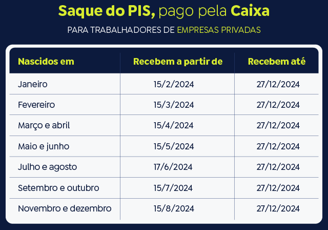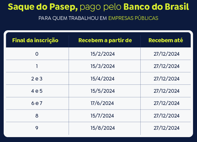O PIS é pago pela Caixa Econômica Federal e o Pasep, pelo Banco do Brasil. Como ocorre tradicionalmente, os pagamentos serão divididos em seis lotes, baseados no mês de nascimento, no caso do PIS, e no número final de inscrição, no caso do Pasep. O saque iniciará nas datas de liberação dos lotes e acabarão em 27 de dezembro de 2024. Após esse prazo, será necessário aguardar a convocação especial do Ministério do Trabalho e Previdência.