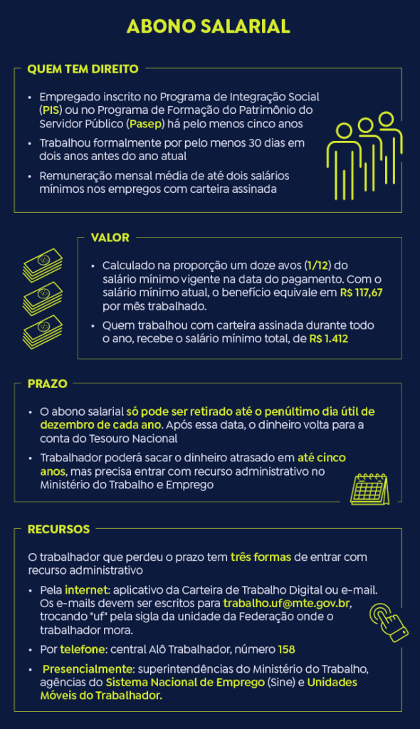 O pagamento do abono salarial de 2022 será feito de 15 de fevereiro a 15 de agosto, conforme o mês de nascimento do trabalhador, para quem recebe o PIS, ou o número final de inscrição, para quem recebe o Pasep.