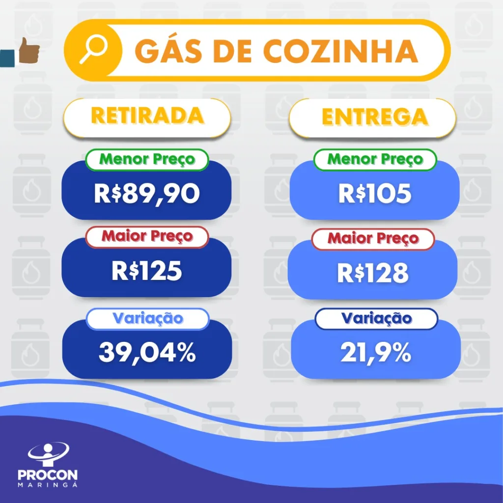 O Procon, da Prefeitura de Maringá, divulgou hoje (13) a pesquisa mensal sobre o preço do gás de cozinha. Foram comparados preços em 41 estabelecimentos em diferentes regiões da cidade. Sendo a maior diferença registrada no produto para retirada na loja, com 39,04%. O mais barato está R$ 89,90 e o mais caro R$ 125, sendo uma economia de R$ 35,10 se o cliente comprar onde vende pelo valor mais baixo.