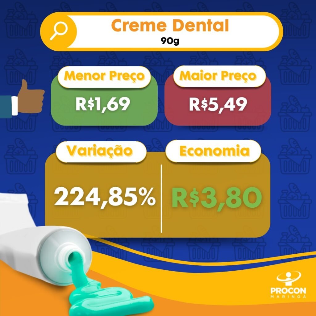 O Procon, da Prefeitura de Maringá, divulgou na manhã de hoje (7) a pesquisa de preços sobre a cesta básica. O que teve maior diferença foi o creme dental com 224,85% de variação. Sendo o mais barato R$ 1,69 e o mais caro R$ 5,49. O levantamento é mensal e realizado em 11 estabelecimentos em diferentes regiões da cidade. Foram comparados preços de 20 itens de mercearia, produtos de higiene e limpeza.