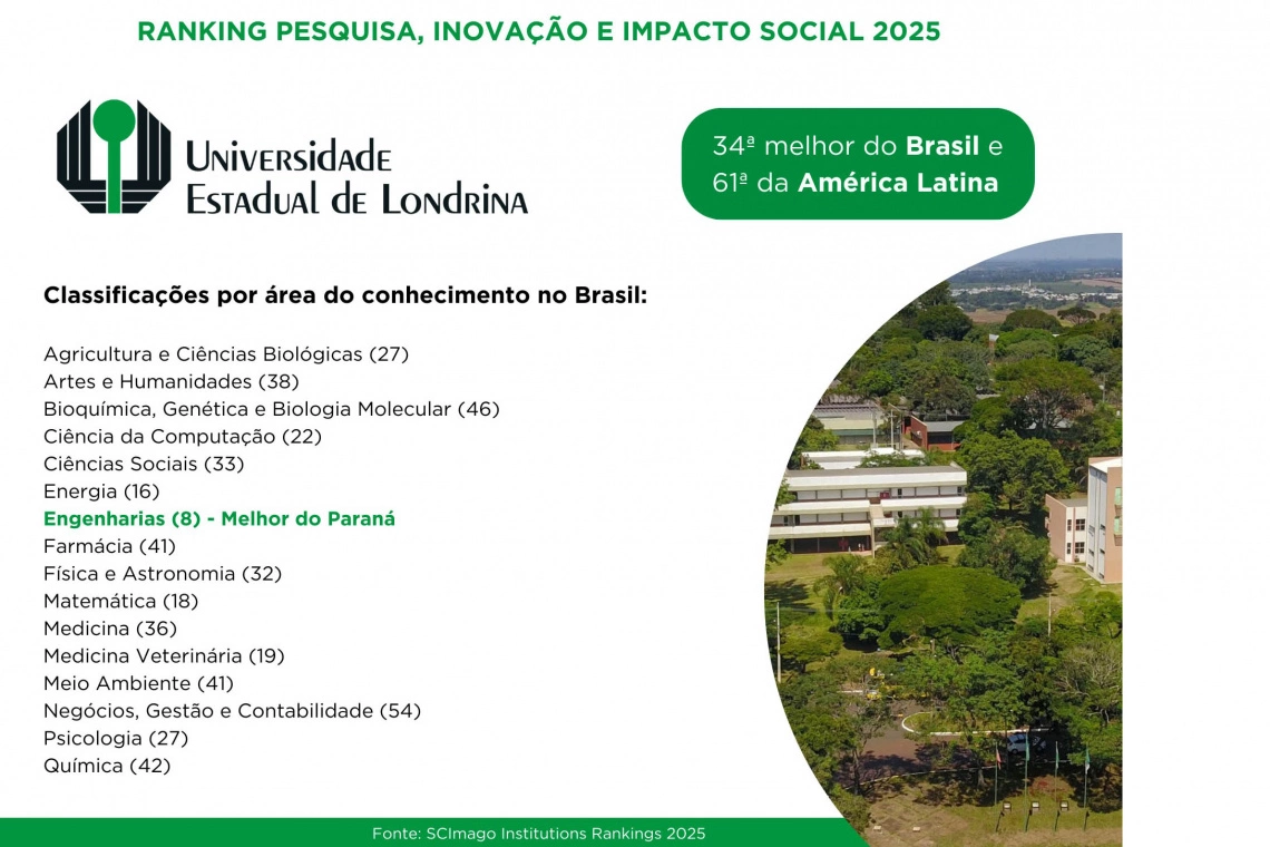 Segundo o ranking, que avalia as instituições com base no desempenho em pesquisa, inovação e impacto social, as universidades estaduais de Londrina (UEL) e de Maringá (UEM) são as mais bem avaliadas do Paraná em Engenharias e em Química, respectivamente. Elas aparecem na oitava posição nacional nessas áreas do conhecimento.