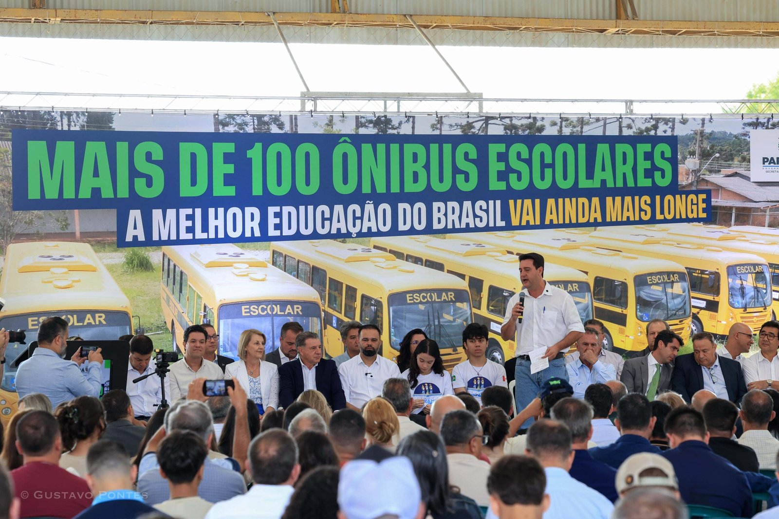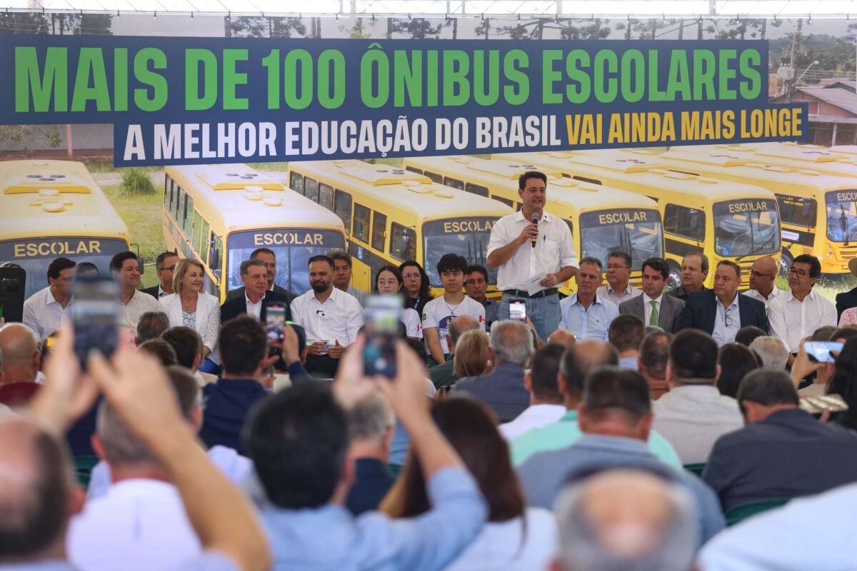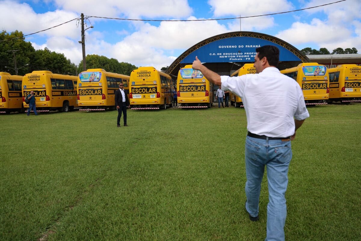 O governador Calos Massa Ratinho Junior iniciou nesta segunda-feira (10) a entrega dos 209 novos ônibus escolares adquiridos para uso no programa Caminho da Escola. Em evento no Parque da Ciência Newton Freire Maia, em Pinhais, na Região Metropolitana de Curitiba, foi entregue o primeiro lote de 113 veículos para atender 97 cidades.