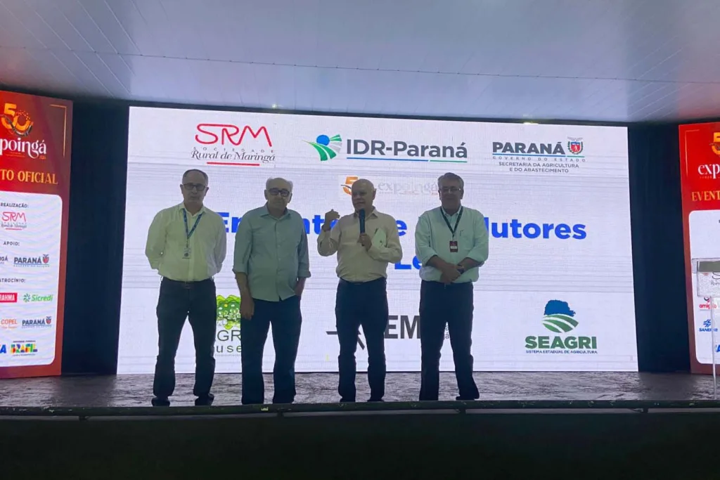 Manejo da fertilidade do solo, certificação de propriedades livres de brucelose e tuberculose, caracterização dos estabelecimentos leiteiros no Paraná e crédito rural foram temas do Encontro de Produtores de Leite realizado nesta quinta-feira (16), durante a Expoingá, em Maringá. O evento, que reuniu especialistas no assunto, produtores e lideranças do setor, foi promovido pelo IDR-Paraná (Instituto de Desenvolvimento Rural do Paraná), Sociedade Rural de Maringá, Sistema Estadual de Agricultura (Seagri) e Universidade Estadual de Maringá (UEM).