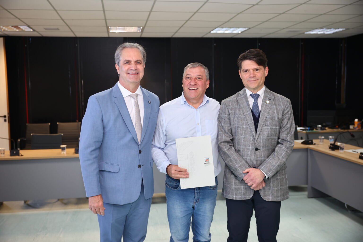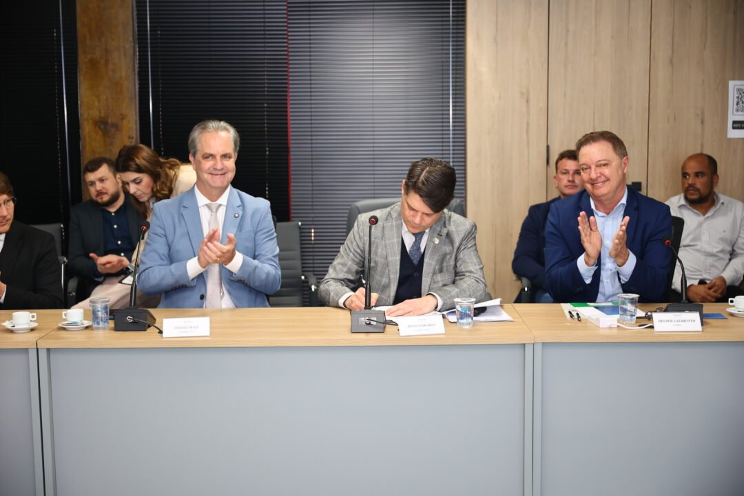 PRESENÇAS – Participaram da solenidade o presidente do Ipardes, Jorge Callado; o secretário estadual do Trabalho, Qualificação e Renda, Do Carmo; o presidente da Assomec e prefeito de Colombo, Helder Luiz Lazarotto; o presidente da Amsulep e prefeito de Contenda, Antonio Adamir Digner; a presidente da AMCG e prefeita de Imbaú, Dayane Sovinski; o presidente da Amunpar e prefeito de Mirador, Fabiano Travain; o presidente da Amunop e prefeito de Sapopema, Paulinho Branco; o presidente da Amsulpar e prefeito de Paula Freitas, Sebastião Dalpra; o presidente da Amsop e prefeito de Dois Vizinhos, Carlinhos Turatto; o presidente da Amcespar e prefeito de Rio Azul, Leandro Jasinski; o presidente da Amerios e prefeito de Francisco Alves, Alírio Mistura; o presidente da Cantuquiriguaçu e prefeito de Foz do Jordão, Francisco Clei da Silva; o presidente da Amocentro e prefeito de Manoel Ribas, José Carlos da Silva Corona; o presidente da Amunorpi e prefeito de Jaboti, Regis William Siqueira Rodrigues.