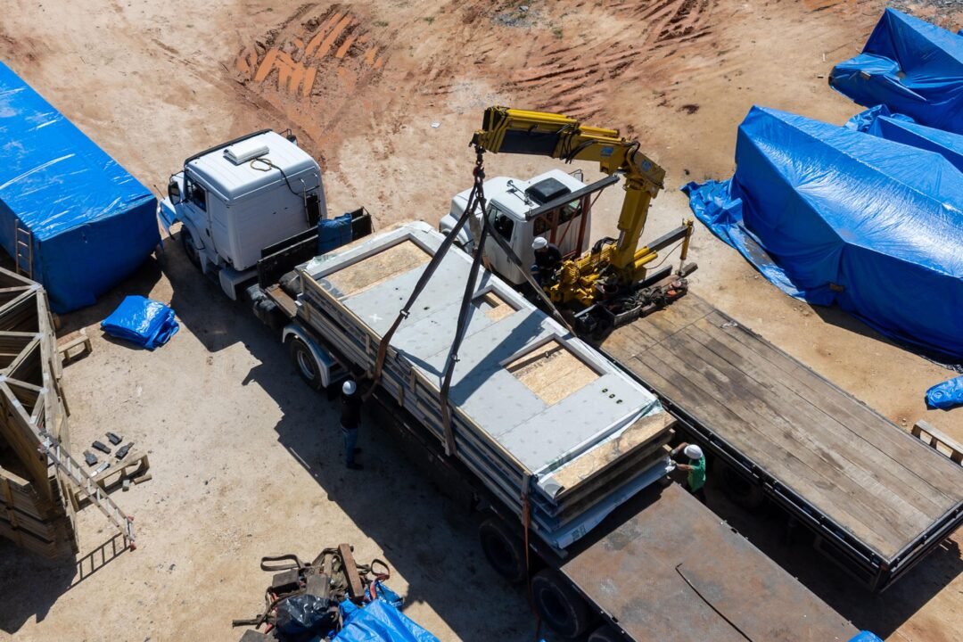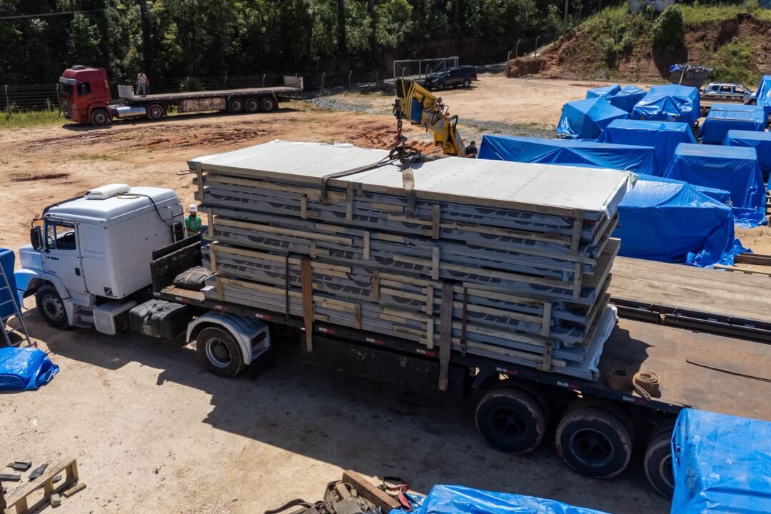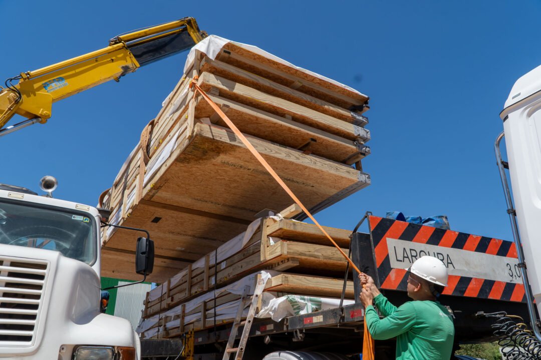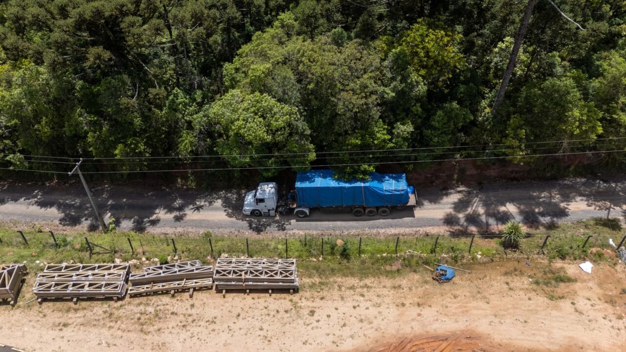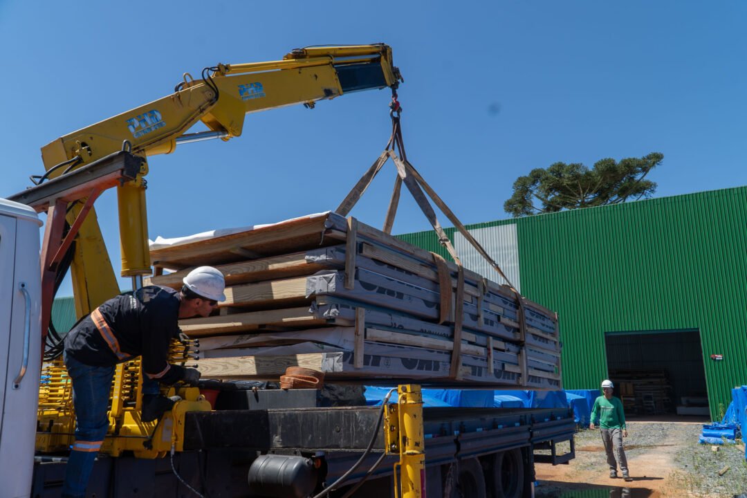 As primeiras estruturas das moradias deixaram Campo Largo, na Região Metropolitana de Curitiba, na tarde desta quinta-feira (20). A expectativa é de que as casas cheguem a Rio Bonito do Iguaçu até o fim da tarde desta quinta. As peças fazem parte do lote inicial fornecido pela empresa Tecverde, responsável pela construção das unidades pré-fabricadas em woodframe. Ao todo, serão investidos R$ 44 milhões do Tesouro do Estado para a aquisição das 320 residências.