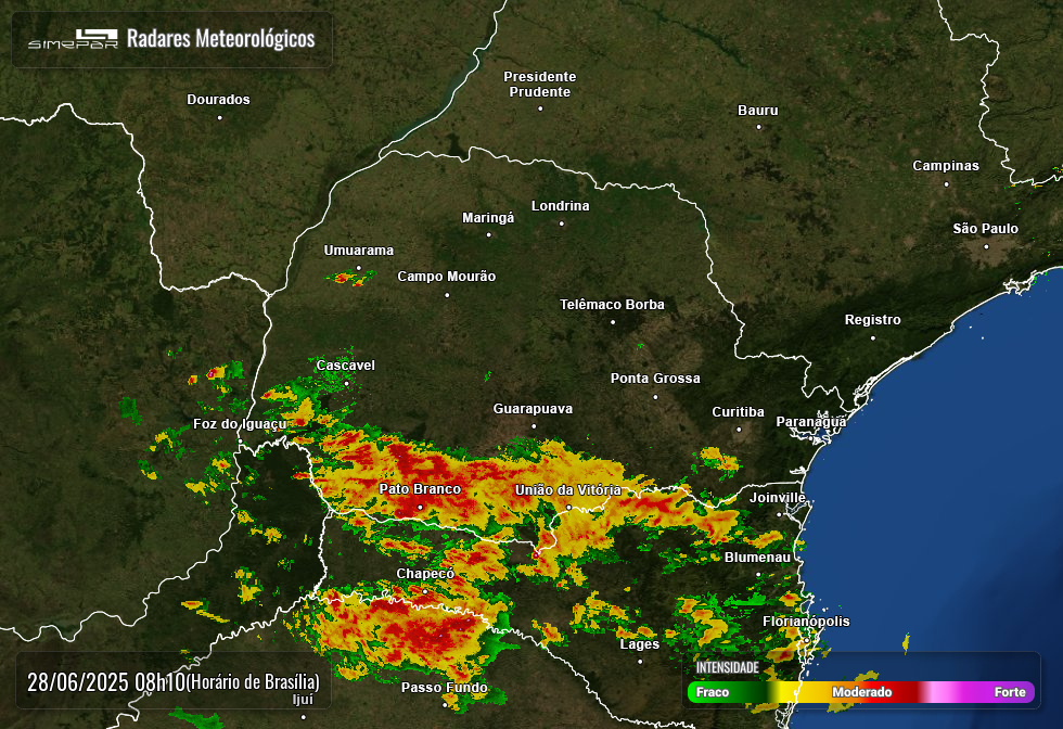 Há previsão de pancadas de chuva com trovoadas na divisa com Santa Catarina. A partir da madrugada de sábado, o alerta é para o potencial de tempestades, com rajadas de vento, queda de granizo e raios, especialmente nas regiões oeste e sudoeste do Paraná.