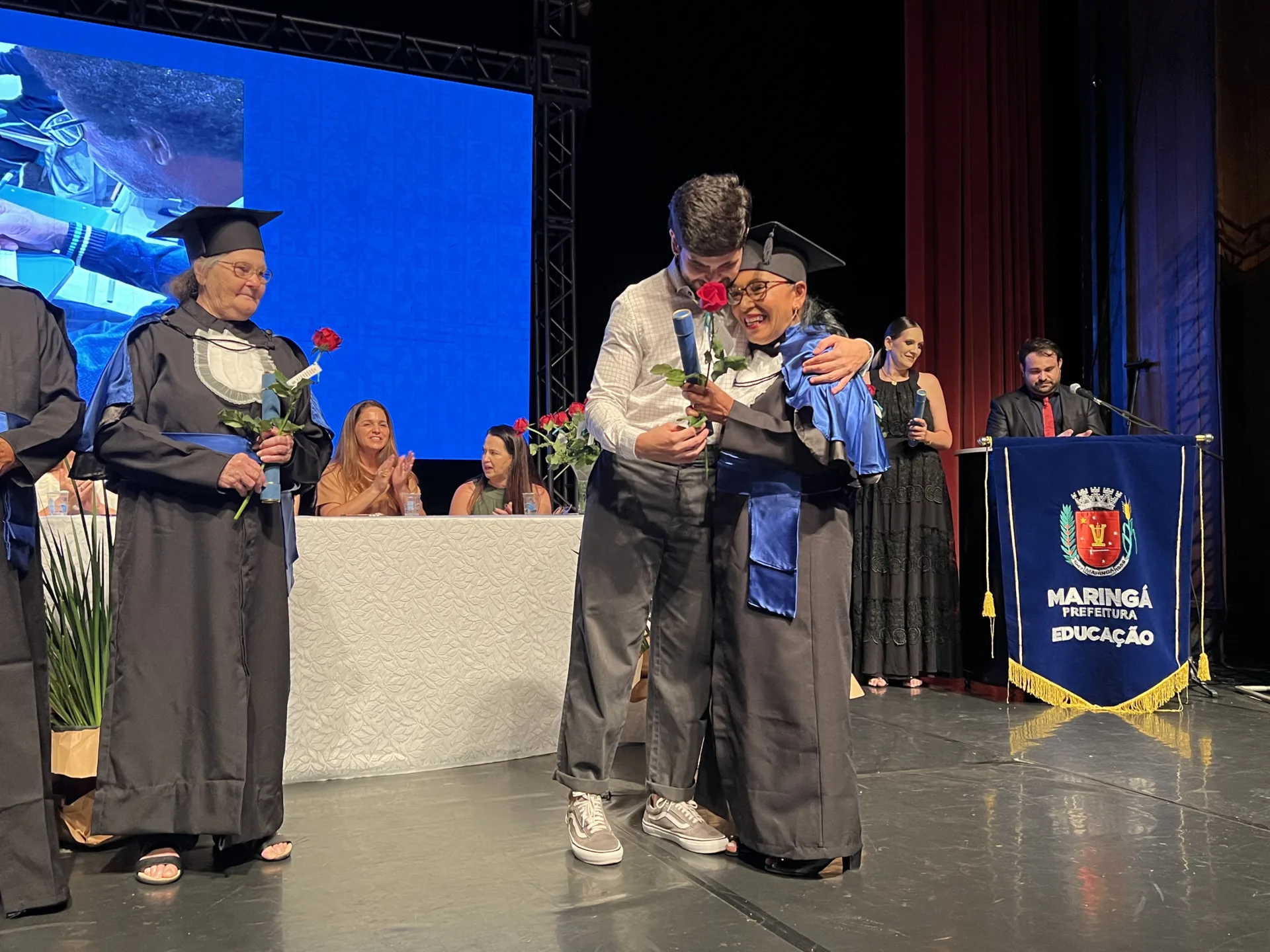 A Prefeitura de Maringá, por meio da Secretaria de Educação, realizou na noite desta segunda-feira, 8, a formatura de 30 alunos da Educação de Jovens e Adultos (EJA). A cerimônia ocorreu no Teatro Calil Haddad e celebrou a conquista de sonhos e o surgimento de novas oportunidades por meio da educação. Familiares, alunos e professores participaram do evento e prestigiaram a celebração dos formandos.
