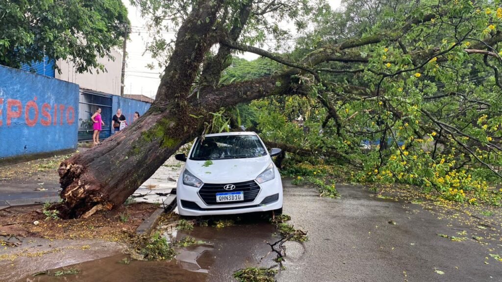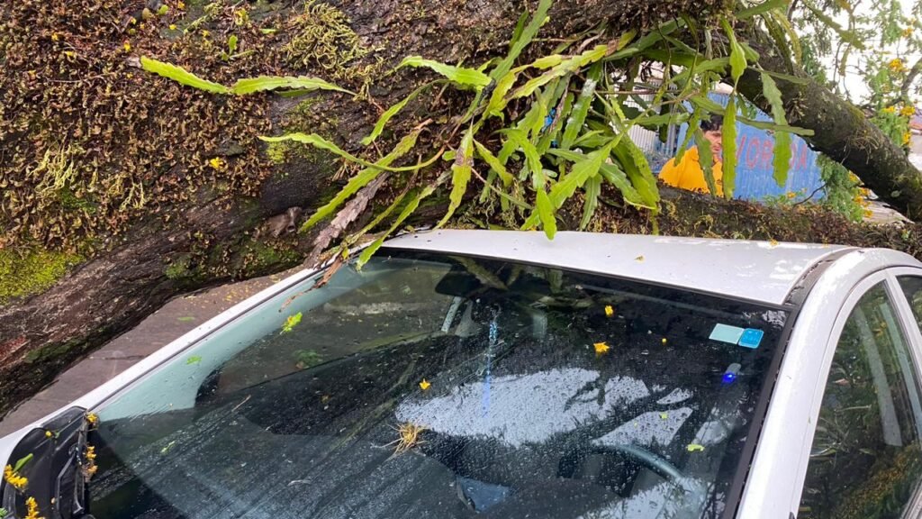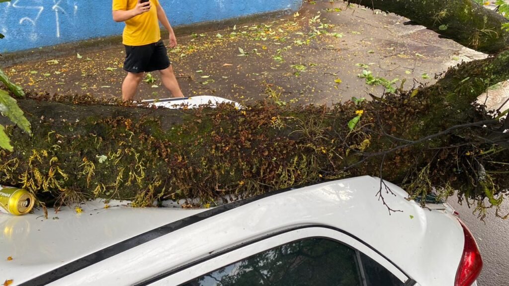 Um carro HB20 foi atingido por uma árvore enorme, o teto de o porta malas do veículo foi destruído. A proprietária disse que o automóvel tem seguro.