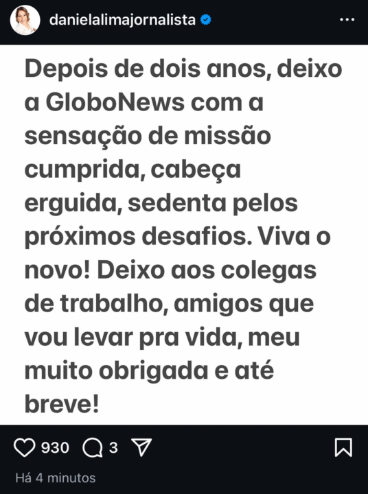 “Saio com a cabeça erguida, sedenta por novos desafios”, declarou Daniela Lima, ressaltando seu início na Globonews, onde ingressou há dois anos, após sua saída da CNN Brasil.