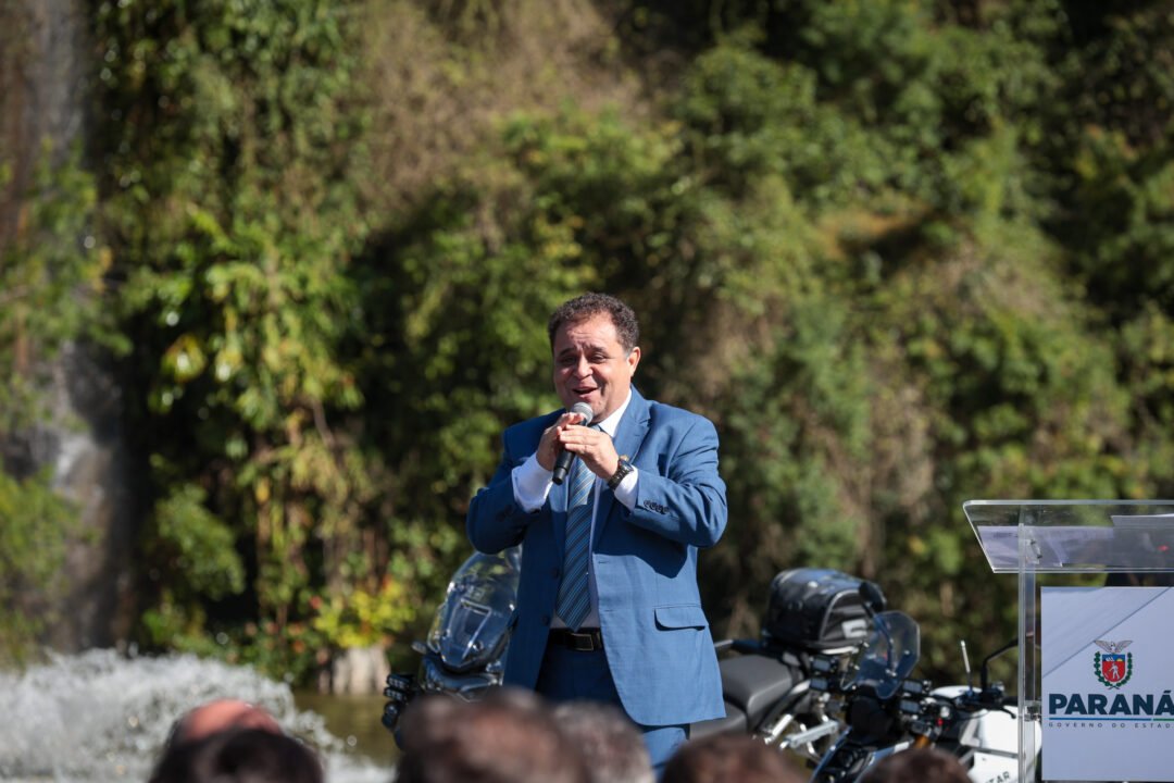 PRESENÇAS – Participaram da solenidade o chefe da Casa Civil, João Carlos Ortega; o secretário estadual das Cidades, Guto Silva; o secretário da Comunicação, Cleber Mata; o diretor-presidente do Detran, Santin Roveda; os deputados federais Toninho Wandscheer, Filipe Barros e Diego Garcia; o presidente da Assembleia Legislativa do Paraná, Alexandre Curi; os deputados estaduais Artagão Júnior, Cantora Mara Lima, Matheus Vermelho, Luiz Fernando Guerra, Cloara Pinheiro, Delegado Jacovós, Delegado Tito Barrichelo, Moacyr Fadel, Flávia Francischini, Batatinha, Fábio Oliveira, Ricardo Arruda e Cobra Repórter; o chefe do Estado-Maior da PMPR, Coronel Paulo Roberto Lima; e comandantes de batalhões da Polícia Militar.
