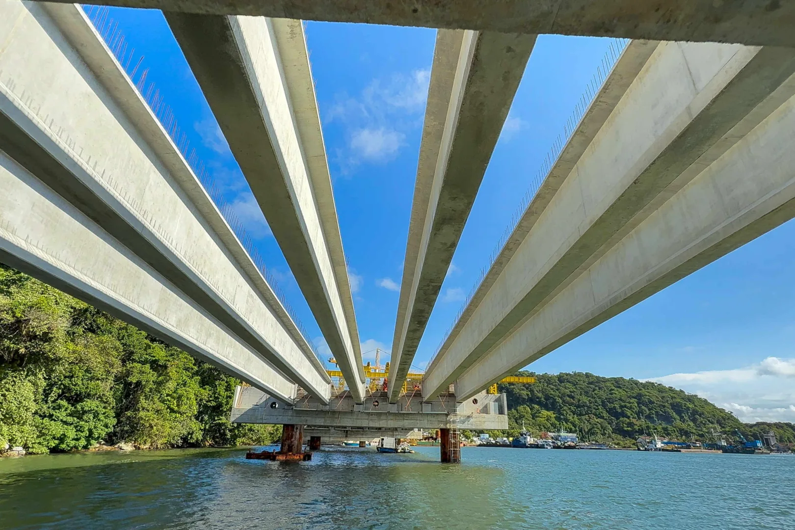 Um dos pontos que mais chama atenção, devido ao tamanho das estruturas, são as bases do trecho estaiado da ponte, que estão sendo instaladas bem no meio da baía. Desde janeiro, o traçado da futura ponte também começou a ficar visível a partir da colocação das vigas longarinas pré-moldadas, que estão sendo colocadas a partir da margem central de Guaratuba.