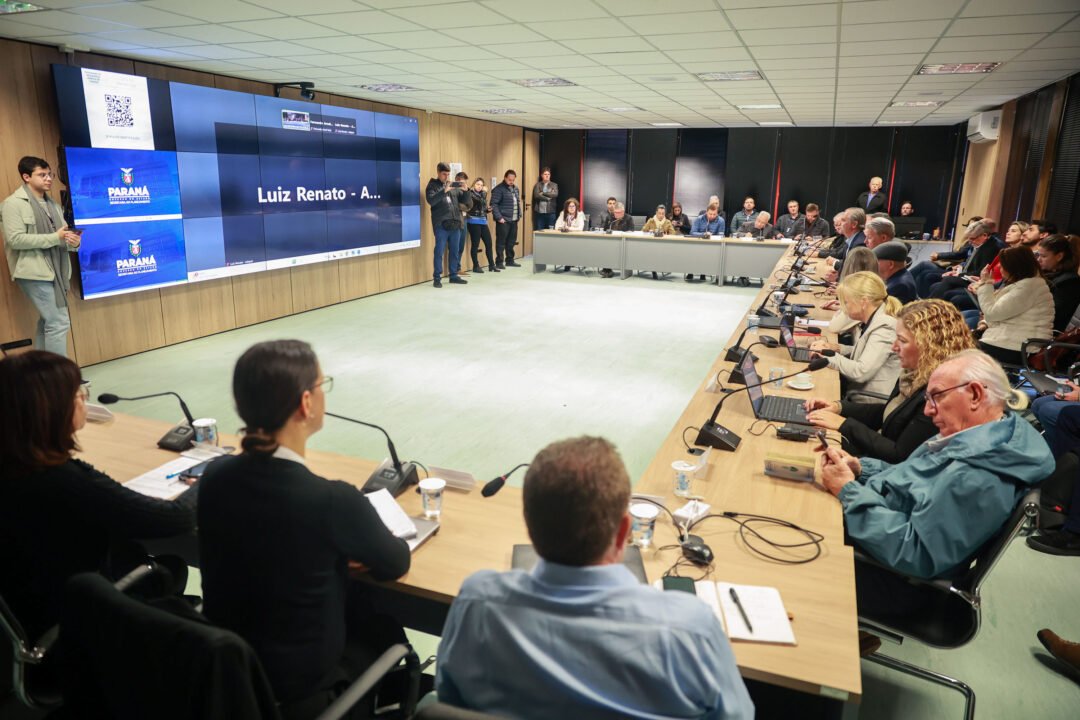 PRESENÇAS – Participaram da reunião técnica o diretor o diretor-geral da Secretaria do Desenvolvimento Sustentável (Sedest), Rodrigo Rodrigues; o diretor-geral da Secretaria do Planejamento, Domingos Trevizan; o diretor-presidente do IDR-Paraná, Natalino Avance de Souza; o presidente da Adapar, Otamir César Martins; e o diretor administrativo da Sanepar, Fernando Guedes; além de demais representantes das outras entidades participantes do programa.