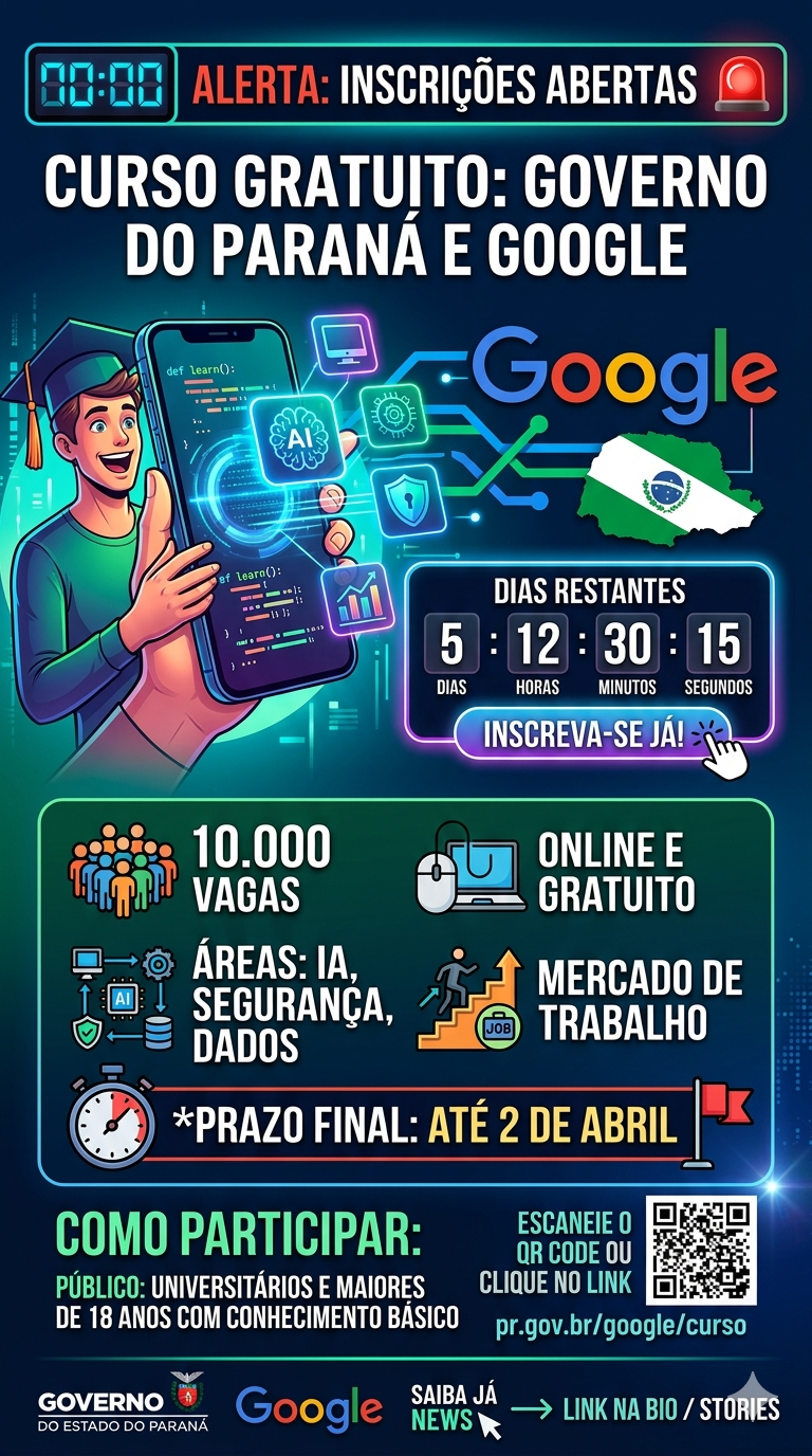 O Governo do Paraná, em parceria com a multinacional Google, abriu inscrições para um curso online gratuito focado em fundamentos de computação. Ao todo, são 10 mil vagas destinadas a estudantes de graduação e pós-graduação em Tecnologia da Informação e Comunicação (TIC), além de entusiastas da área com mais de 18 anos.