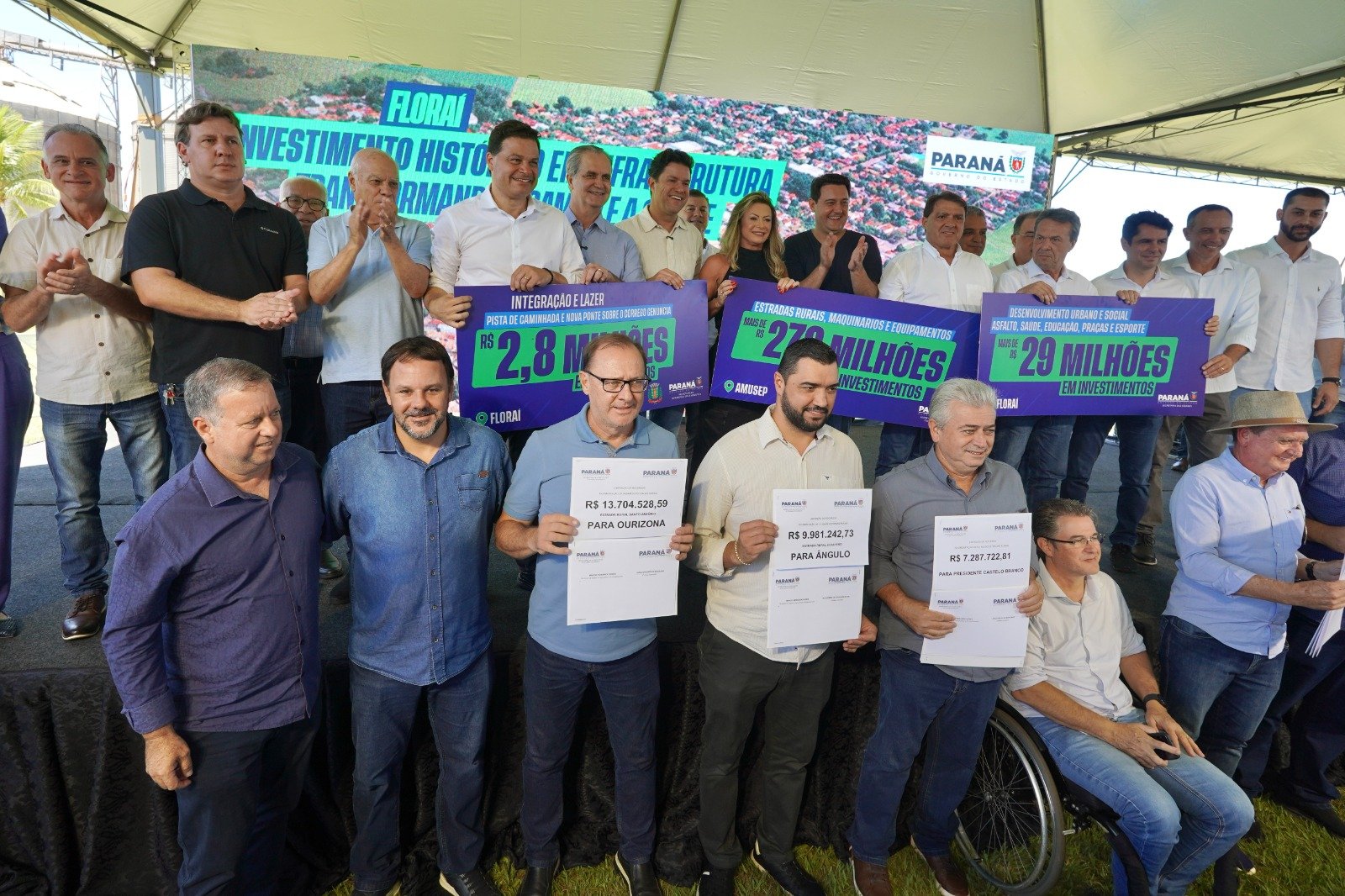 Na sequência, em Floraí, o secretário Guto Silva detalhou novos convênios que totalizam R$ 29 milhões para o município pela Secretaria das Cidades. Os recursos contemplam uma ampla requalificação urbana, incluindo a reforma do Terminal Rodoviário Urbano, melhorias na Praça João Marques, entre outras, ampliação de escola municipal e a construção de Centro de Hidroterapia e Fisioterapia, pavimentações urbanas e outros investimentos em centro comunitário, estrada vicinal municipal, pavimentação de vias urbanas e infraestrutura básica urbana.