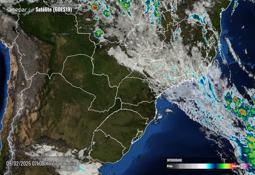 Nesta segunda-feira (09), a nebulosidade aumenta gradualmente. A partir da tarde, pancadas de chuva isoladas acompanhadas de trovoadas são esperadas no Leste (RMC e praias), nos Campos Gerais e no Norte do estado. Apesar da instabilidade, não há previsão de volumes expressivos de precipitação.