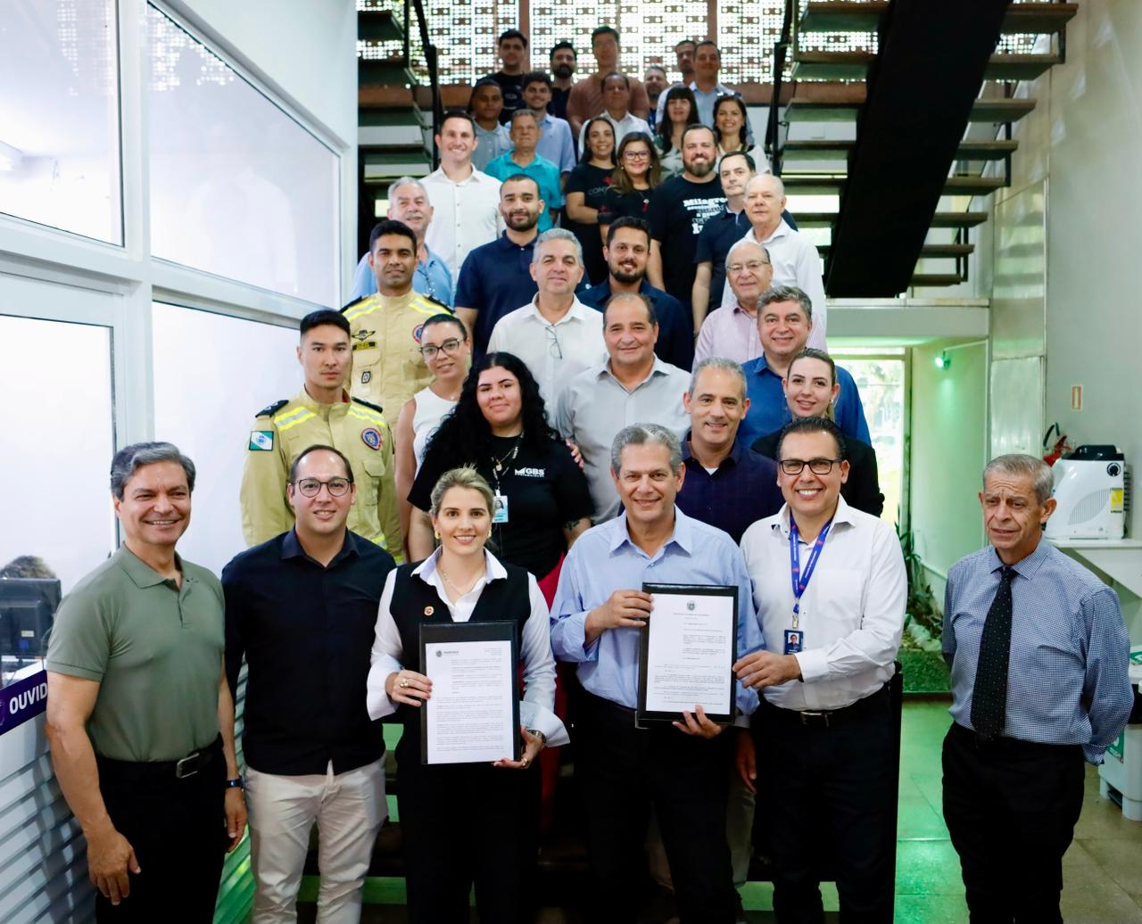 A Prefeitura de Maringá formalizou nesta sexta-feira, 6, a entrada em vigor da Lei Desenrola Maringá (Lei Complementar nº 1.514), que atualiza as regras do licenciamento de atividades econômicas e estabelece um conjunto de medidas para reduzir a burocracia na emissão de alvarás no município. A legislação é de autoria da presidente da Câmara de Vereadores, a vereadora Majô. O ato contou com a presença de autoridades, representantes do setor produtivo e entidades de classe.