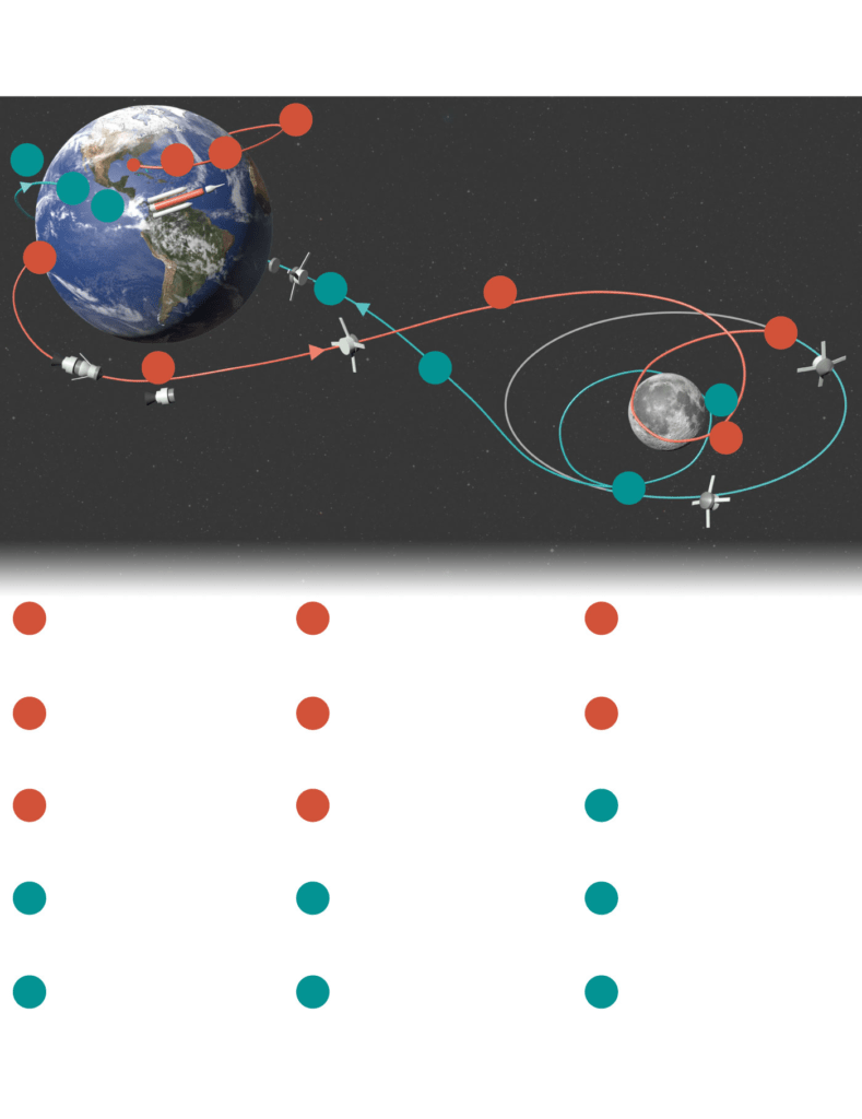 Conforme a Nasa, a Orion entrará na esfera de influência da Lua. Com isso, o satélite da Terra passa a ser a principal força gravitacional atuante na espaçonave — e não mais a Terra. Os controladores de voo conduzirão uma queima de sobrevoo, utilizando o propulsor principal, para aproveitar a força da gravidade da Lua, acelerar a espaçonave e direcioná-la para uma órbita retrógrada distante além do satélite. A órbita é chamada de retrógrada porque a cápsula viajará ao redor da Lua na direção oposta à que a Lua gira ao redor da Terra.