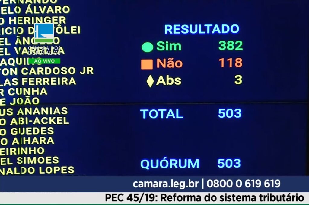 O plenário da Câmara dos Deputados, aprovou na noite desta quinta-feira (5) e na madrugada, a Proposta de Emenda à Constituição da reforma tributária (PEC 45/19) em 382 votos a favor no primeiro turno e 375 no segundo.