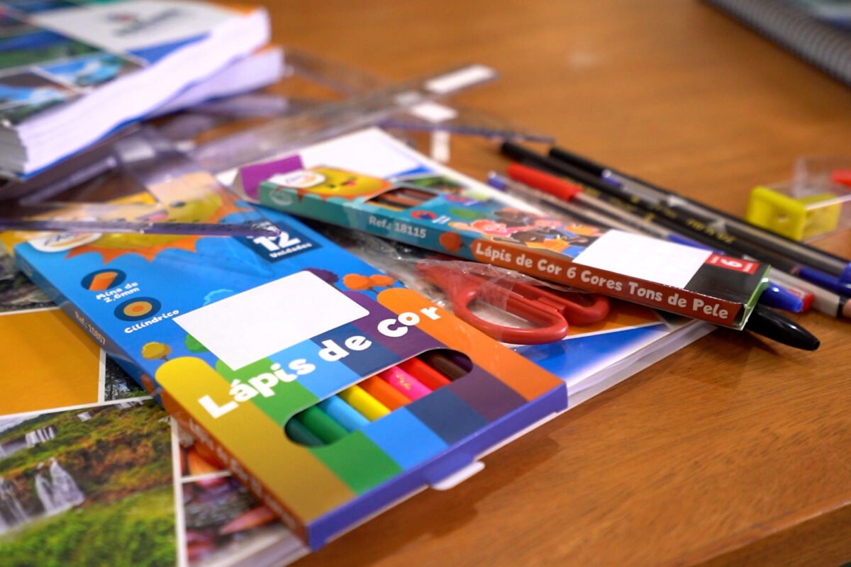 Os conjuntos contam com cadernos, canetas, lápis e outros materiais. Cada kit tem uma variação de itens, de acordo com a idade do aluno e as necessidades pedagógicas de cada série.