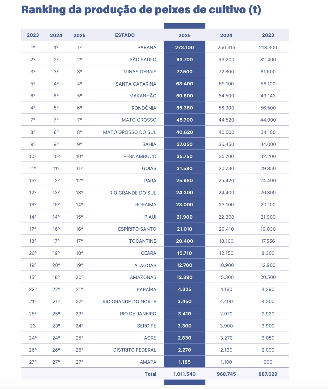 São Paulo aparece na segunda posição no ranking nacional de produção de peixes de cultivo, com 93.700 toneladas, volume 0,54% maior do que o de 2024. Minas Gerais (77.500 t) está logo atrás de São Paulo, seguido por Santa Catarina (63.400 t) e Maranhão (59.600 t), que ganhou uma posição e fecha a lista dos cinco primeiros do ranking.