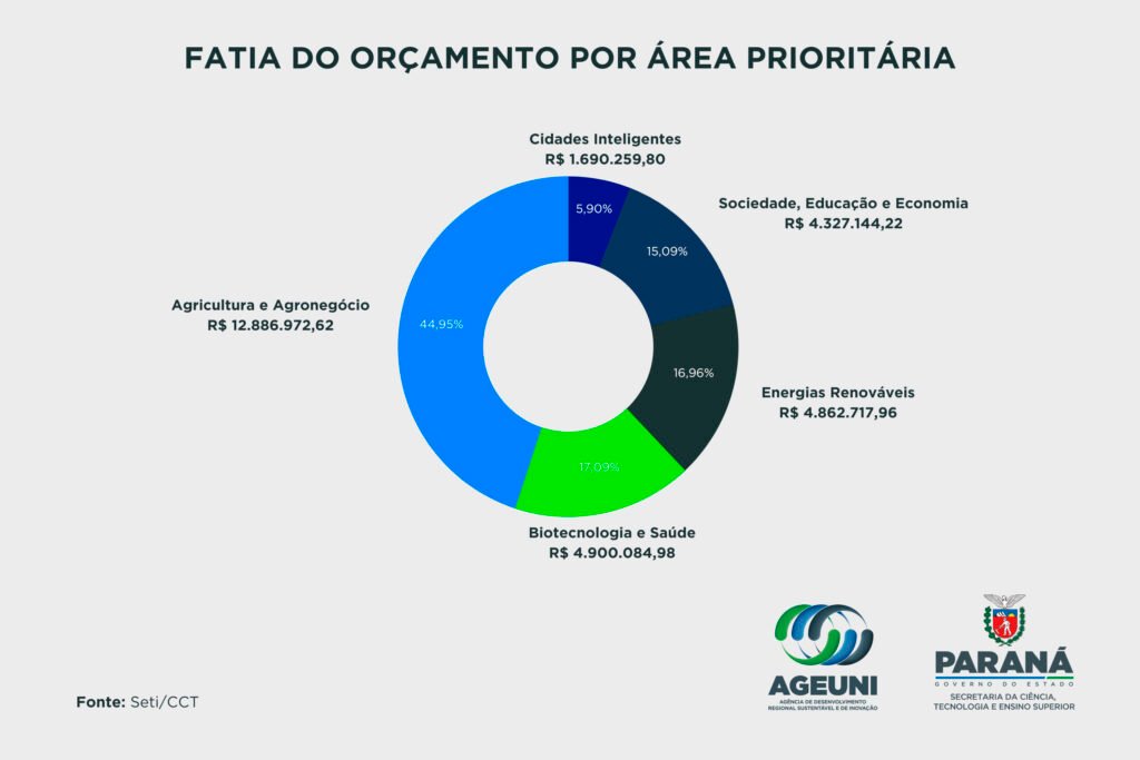 As áreas de biotecnologia e saúde, energias renováveis, economia, educação e sociedade e cidades inteligentes totalizam, respectivamente, R$ 4,9 milhões (17,09%), R$ 4,8 milhões (16,96%), R$ 4,3 milhões (15,09%) e R$ 1,6 milhão (5,9%).