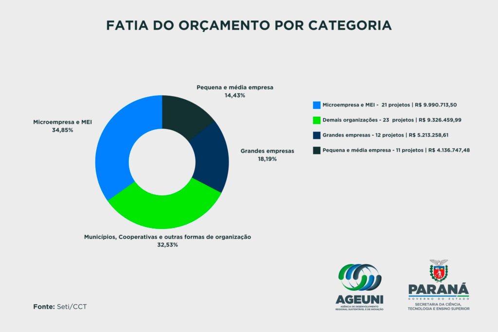A iniciativa tem amparo no Programa de Estímulo às Ações de Integração Universidade, Empresa, Governo e Sociedade, denominado Agência de Desenvolvimento Regional Sustentável e de Inovação (Ageuni). O financiamento envolve recursos não reembolsáveis do Fundo Paraná, dotação gerenciada pela Secretaria da Ciência, Tecnologia e Ensino Superior (Seti) para o fomento científico e tecnológico. O orçamento foi ampliado para atender o máximo de demandas.