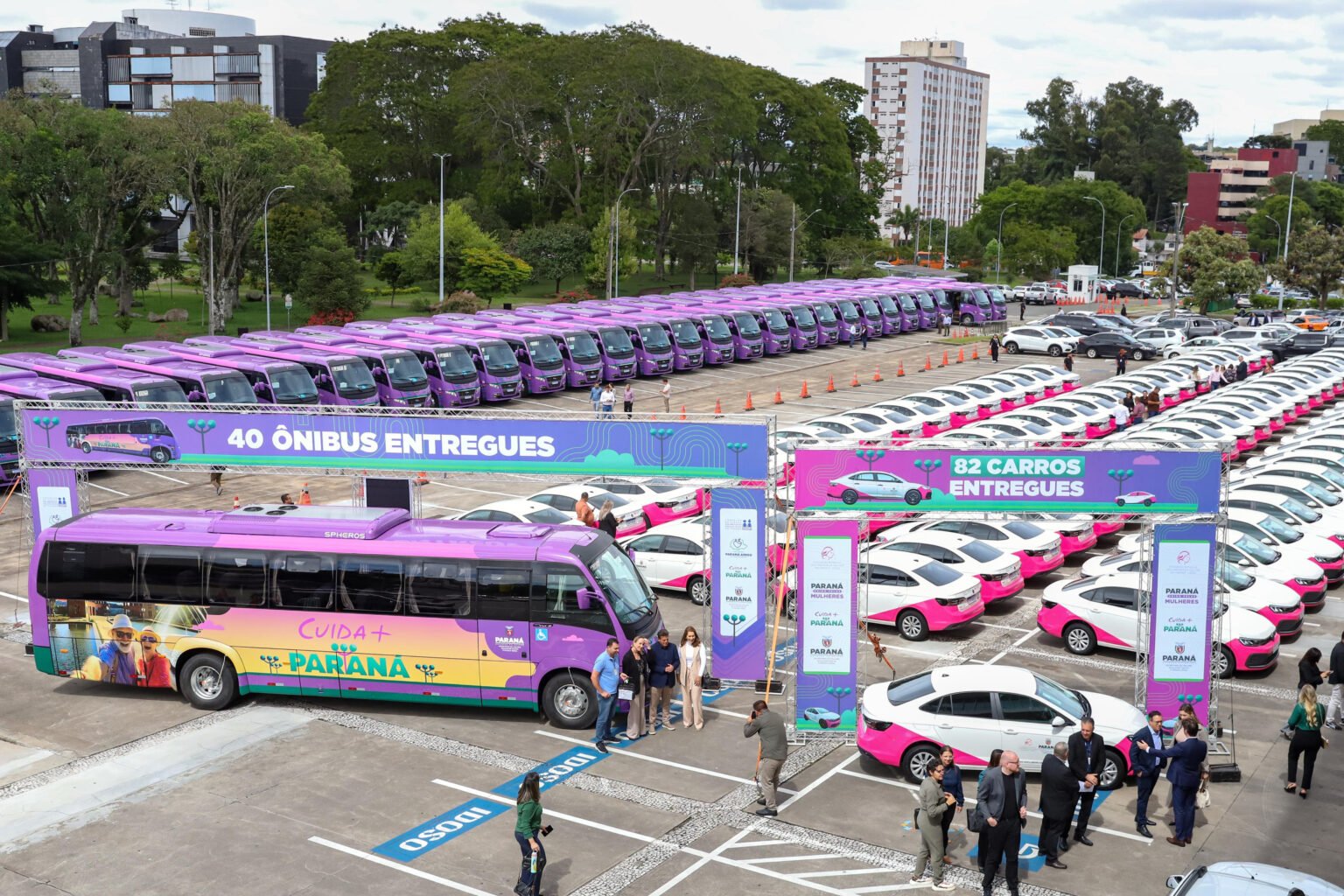 ÔNIBUS – A entrega dos primeiros 40 ônibus Cuida Mais Paraná complementa o pacote de investimentos. Os veículos são voltados ao transporte de grupos de pessoas idosas e fazem parte da política estadual que amplia a mobilidade, participação social e acesso a atividades de cultura, esporte, lazer e turismo. O investimento soma R$ 35,9 milhões. A distribuição dos ônibus considerou a certificação como Cidade Amiga da Pessoa Idosa pela Organização Mundial da Saúde e o percentual da população idosa de cada município.