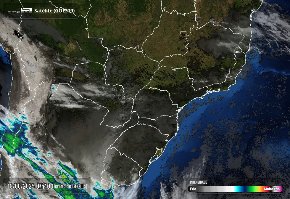 A previsão indica condição de alguma chuva, vento e trovoada entre o sul do Paraguai e as porções do oeste paranaense, alertando para a possibilidade de eventos climáticos mais intensos nessas regiões.
