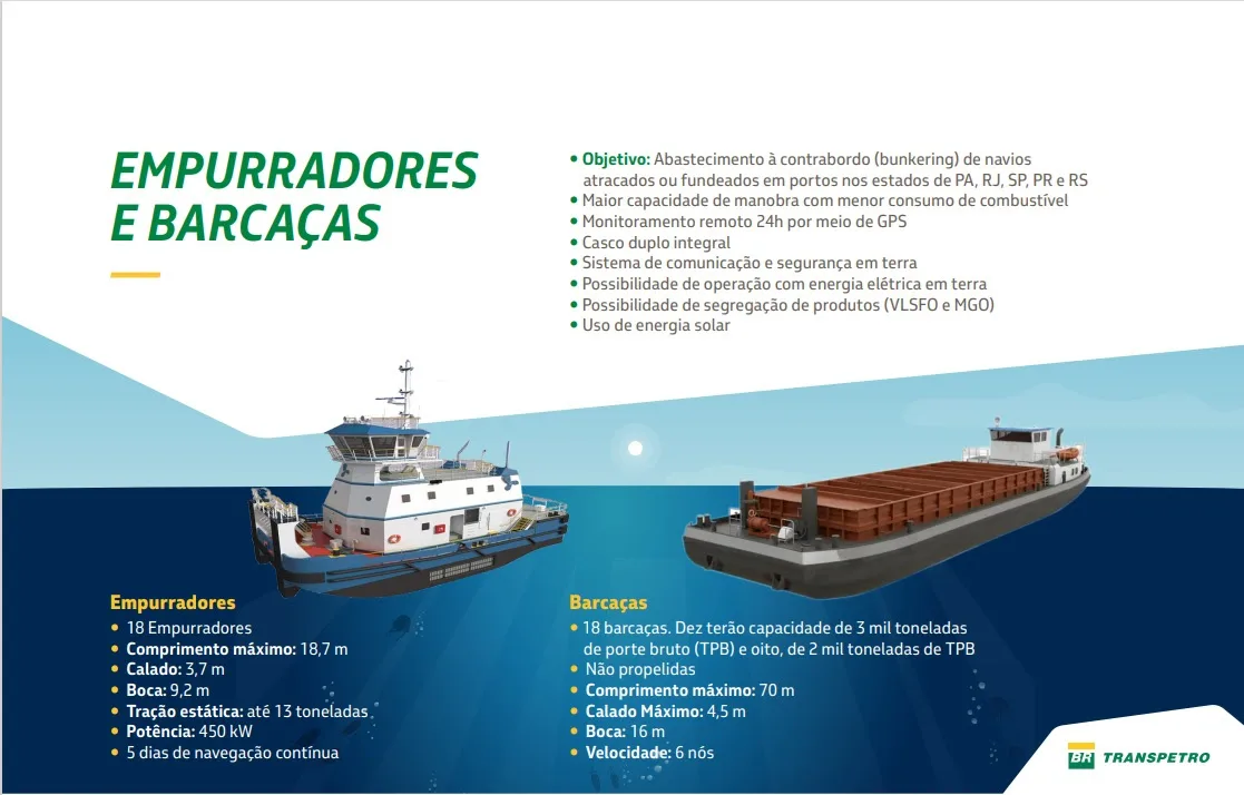 A Transpetro também assina os contratos para aquisição de 18 barcaças e 18 empurradores. A encomenda, que representa um investimento de R$ 620,6 milhões, marca a entrada da Transpetro na navegação interior (águas abrigadas ou parcialmente abrigadas, como rios, lagos, canais, baías e lagoas), o que consolida a companhia como uma das principais operadoras de transporte de derivados de petróleo e de biocombustíveis no modal fluvial.