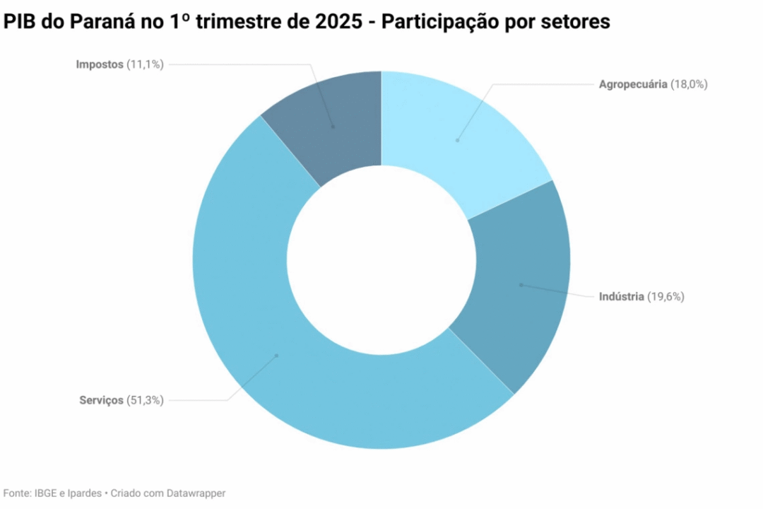 De acordo com o levantamento, o valor total do PIB do Paraná de janeiro a março foi de R$ 210,9 bilhões. Deste montante, R$ 37,9 bilhões são oriundos da atividade agropecuária, o que equivale a 18%. Outros R$ 41,4 bilhões foram produzidos pela indústria (19,6%) e R$ 108,1 bilhões pelo setor de serviços (51,3%), sendo os R$ 23,5 bilhões restantes de impostos (11,1%).