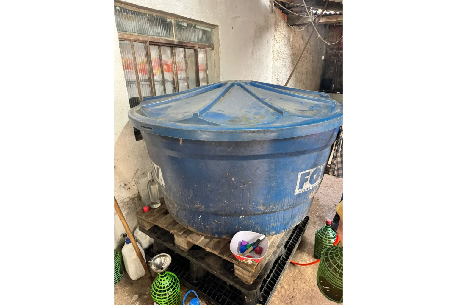 No local, foi constatado o armazenamento irregular de grande quantidade de bebida alcoólica em uma caixa d’água. No recipiente, o proprietário realizava a mistura com outras substâncias para posterior engarrafamento e comercialização.